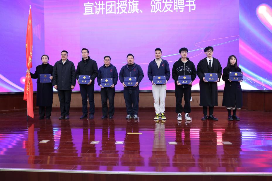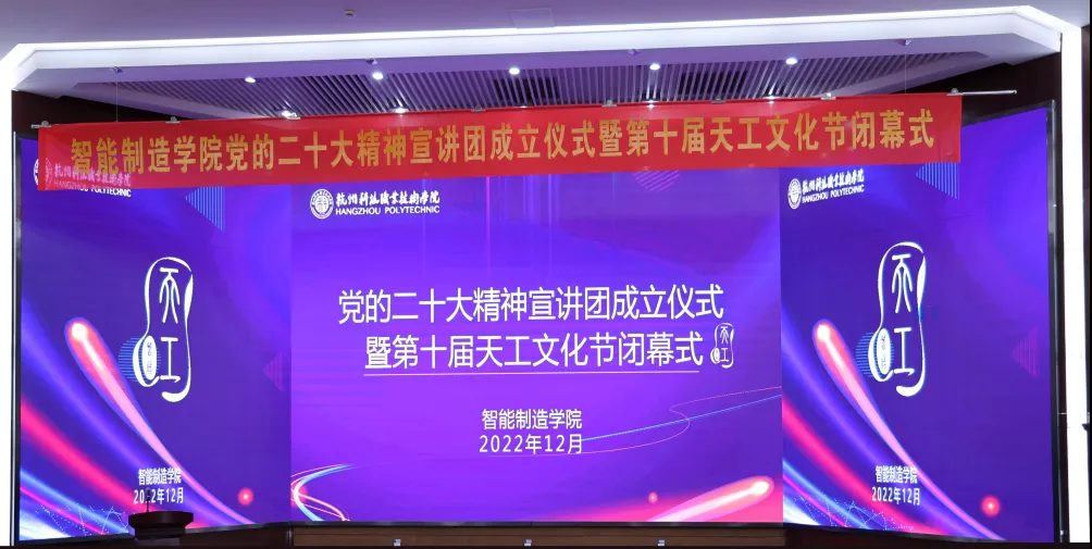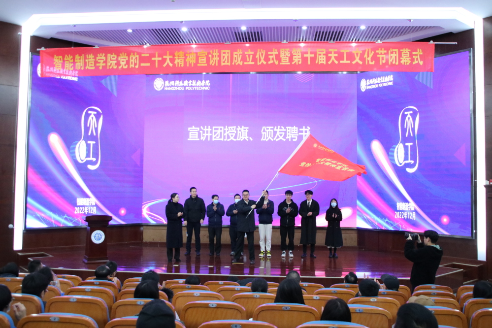 近日,智能制造学院党的二十大精神宣讲团成立仪式暨第十届天工文化节闭幕式在图书馆报告厅举行。党委书记谢列卫,党委委员、副校长赵悦林,党委委员、组织部部长朱宝宏出席活动,宣传部、学生处负责人,各二级学院党总支负责人、学工办负责人和智能制造学院全体教师、学生代表参加。