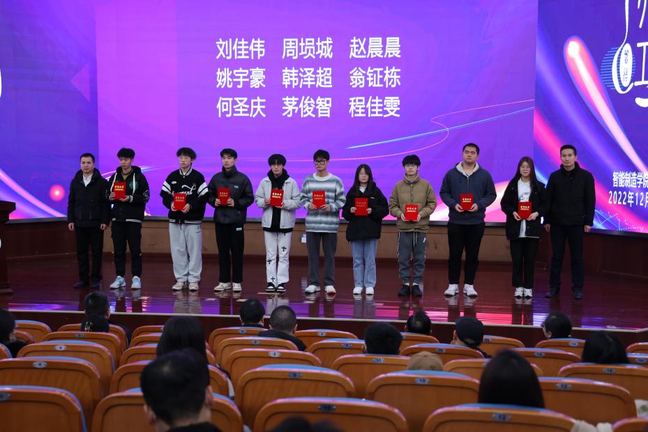 2022年,智能制造学院涌现出了大批优秀师生,他们锐意进取,开拓创新,在各类专业技能竞赛和学科综合成绩上取得了骄人成绩。闭幕式现场,谢列卫、赵悦林,智能制造学院党总支书记陈韵雯、副院长谢茂青、党总支副书记张学良、副院长羊荣金为获奖者颁发证书。