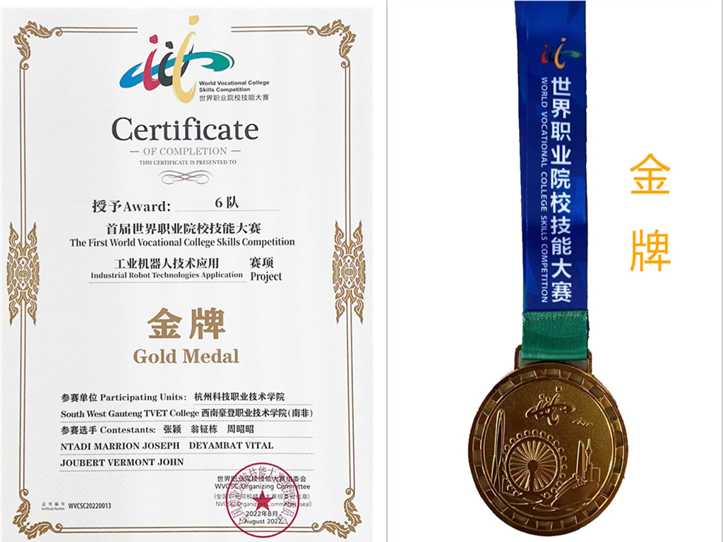 当看到最后一个工件被准确抓取拼接,严丝合缝地形成完整成品入库,杭州科技职业技术学院选手周昭昭、张颖和翁钲栋在心里暗自喊了一声“稳了!”果然,比赛结果揭晓,杭州科技职业技术学院与西南豪登职业技术学院中外联队在首届世界职业院校技能大赛——工业机器人技术应用赛项中以满分成绩夺得金牌,杭科院也成为浙江省唯一获得世界职业院校技能大赛金牌的高职院校。