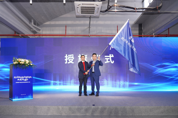 城建校友分会会长商峻宣布杭科院校友总会城建校友分会杭州余杭临平地区校友联谊会成立,并向杭州余杭临平地区校友联谊会授旗。