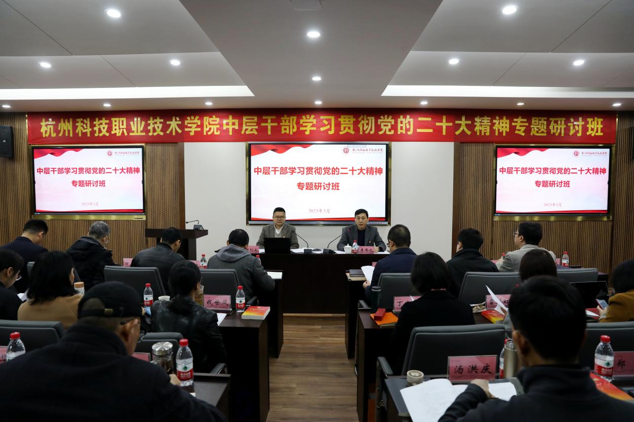3月24日,杭科院中层干部学习贯彻党的二十大精神专题研讨班在高桥校区开班。党委书记谢列卫以《在中国式现代化新征程上,杭科院如何进一步推进“两步走 创一流”事业发展目标》为题作首场辅导报告。党委副书记寿伟义主持开班仪式,全体中层干部参加。