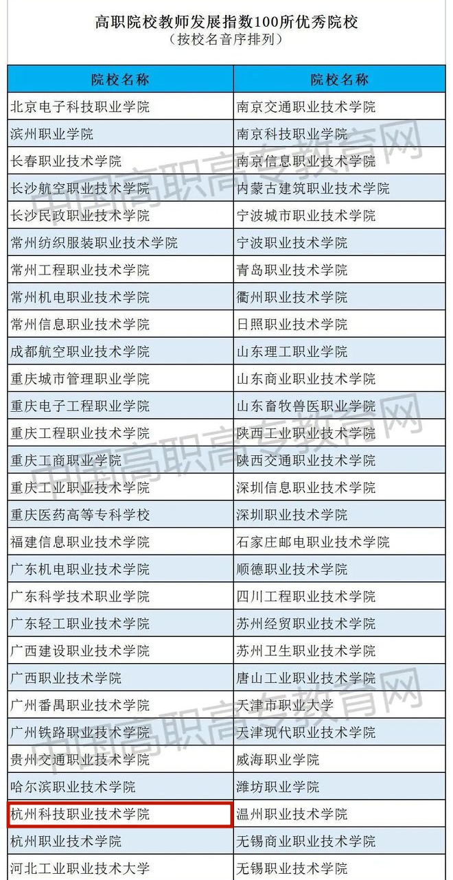 近日,由中国教育科学研究院、全国职业高等院校校长联席会议编制的《2022中国职业教育质量年度报告》正式出版。我校入选全国高职院校教师发展指数100所优秀院校。