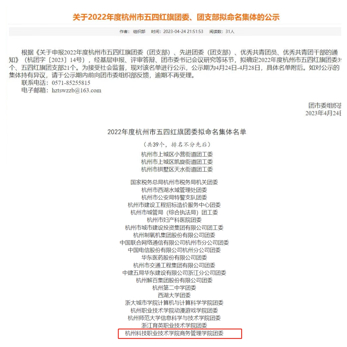 青春五四,砥砺前行。近日,杭州团市委公布《关于2022年度杭州市五四红旗团委、团支部拟命名集体的公示》,我校商务管理学院团委获评“2022年度杭州市五四红旗团委”称号。荣誉的背后,是商务管理学院无数青年学子矢志奋斗的故事,是无数团干部扎根奉献的故事,也是共青团工作成效的生动体现。