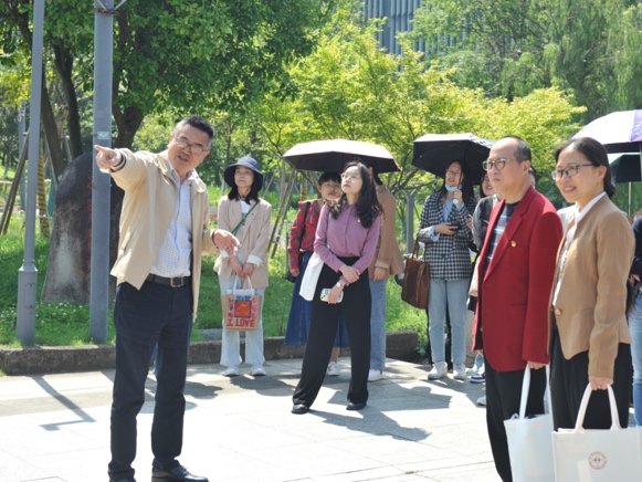 谢列卫向应金萍一行的来访表示热烈欢迎,并沿着校园中轴线文化景观带介绍了我校建设过程、发展历史和文化脉络。围绕校园文化建设,谢列卫介绍了学校的布局规划,并表示全校正学习贯彻党的二十大精神,深入开展学习贯彻习近平新时代中国特色社会主义思想主题教育,坚持立德树人,坚持“五育并举”,培育时代新人,全面发展素质教育,扎实推进学校“创一流”事业发展。