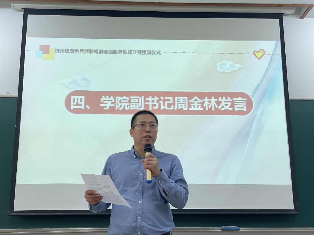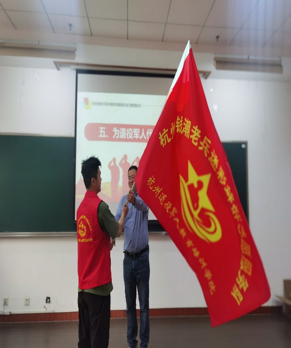 钱潮老兵钱迷彩蜂群志愿服务队的志愿者全部来自继续教育学院退役军人学历教育学生和技能培训学员。继续教育学院党总支副书记周金林为志愿服务队授旗。周金林充分肯定志愿服务队成立的重要意义,希望志愿服务队把“奉献、友爱、互助、进步”的志愿者精神与退役军人“退役不褪志,退伍不褪色”的光荣传统结合起来,把体现军的特色、军的味道和体现继续教育学院的特点气质结合起来,努力把“迷彩蜂群退役军人志愿服务队”打造成全市“橄榄绿”“志愿红”中亮眼的志愿服务品牌。