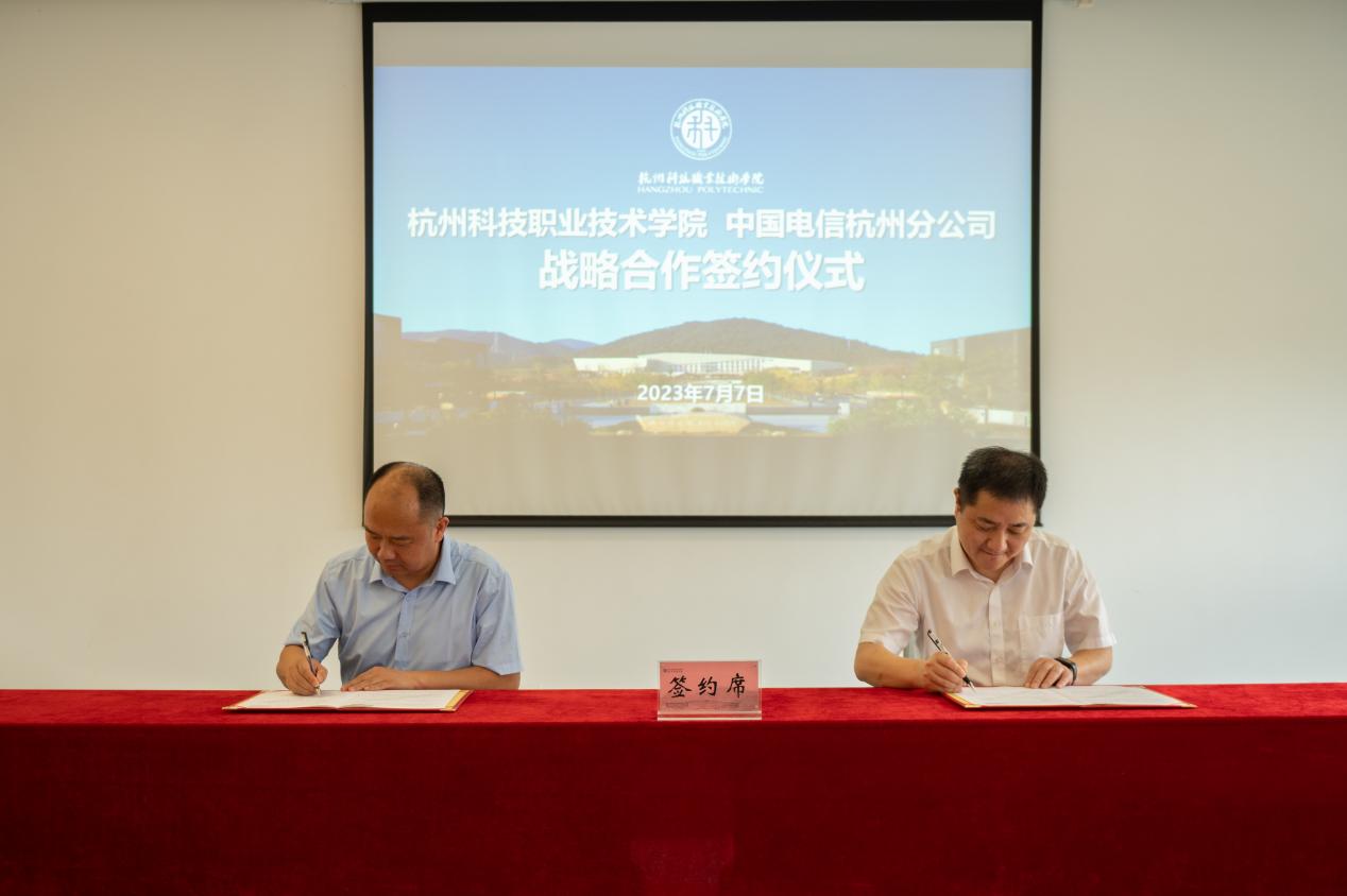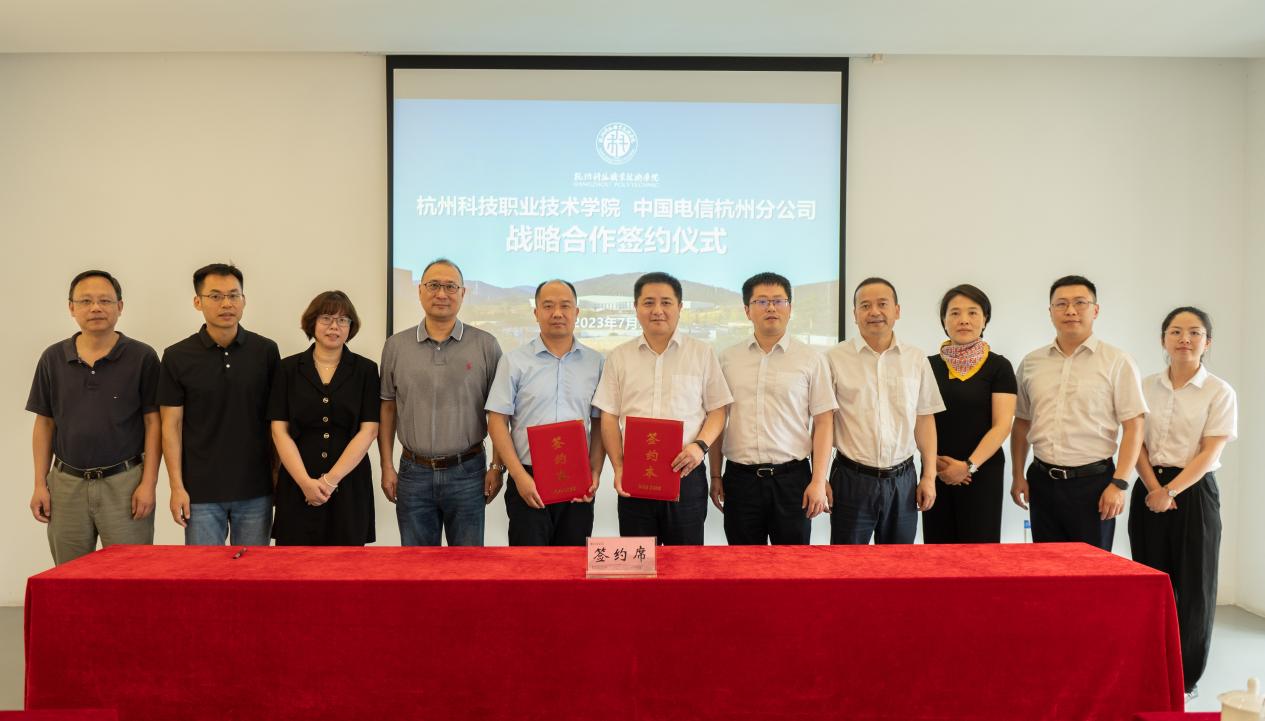 7月7日,我校与中国电信杭州分公司(以下简称“杭州电信”)战略合作协议签约仪式在高桥校区校史馆会议室举行。校长温正胞、党委委员、副校长袁俊、中国电信杭州分公司总经理沈文强出席会议,中国电信杭州分公司有关人员和我校有关职能部门负责人参加签约仪式。
