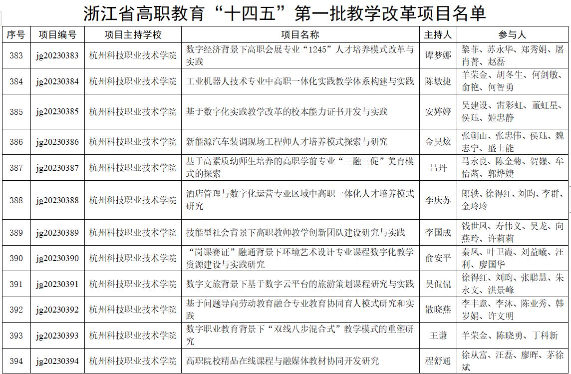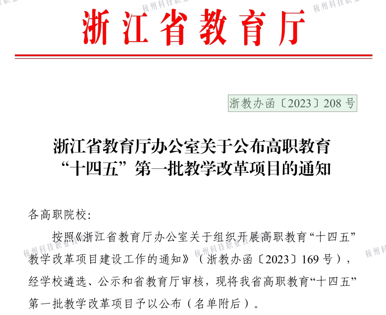 近日,浙江省教育厅发布《浙江省教育厅办公室关于公布高职教育“十四五”第一批教学改革项目的通知》。经组织申报、专家评审、遴选公示和省教育厅审核,我校《数字经济背景下高职会展专业“1245”人才培养模式改革与实践》等12项课题成功荣获第一批立项。