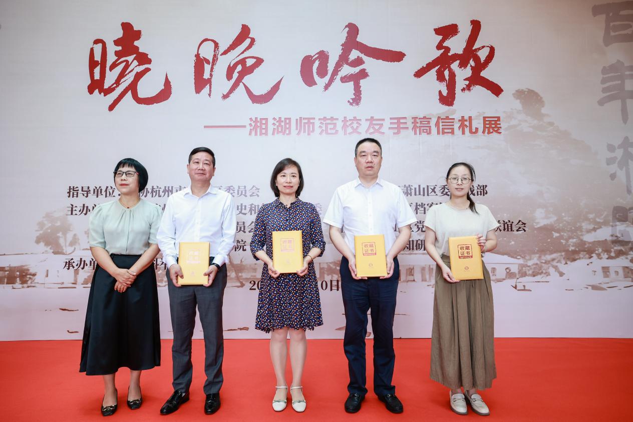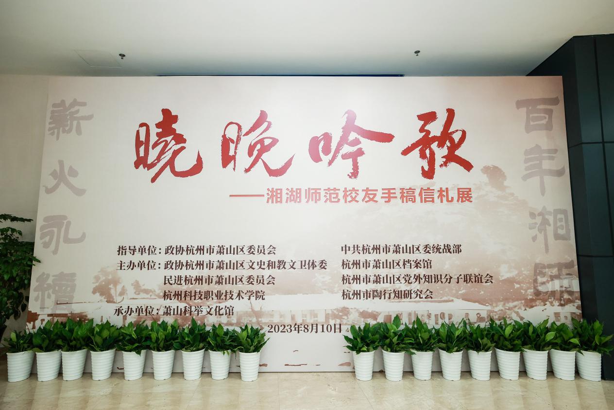 8月10日,“晓晚吟歌——湘湖师范校友手稿信札展”在萧山区档案馆开幕。我校党委书记、杭州市陶行知研究会会长谢列卫出席并讲话。湘师80届校友、市十三届人大常委会党组副书记、副主任郑荣胜,萧山区政协主席叶建宏,萧山区委常委、统战部部长倪世英,萧山区政协副主席黄晓燕、陈金良,湘师89届校友、临平区政协副主席章桂娣等领导出席仪式,校宣传部、陶研中心等部门负责人和杭州市陶研会代表参加。本次展览由杭州科技职业技术学院、杭州市陶行知研究会和萧山区政协文史和教文卫体委、萧山区档案馆、民进萧山区委会、萧山区知联会等联合主办。