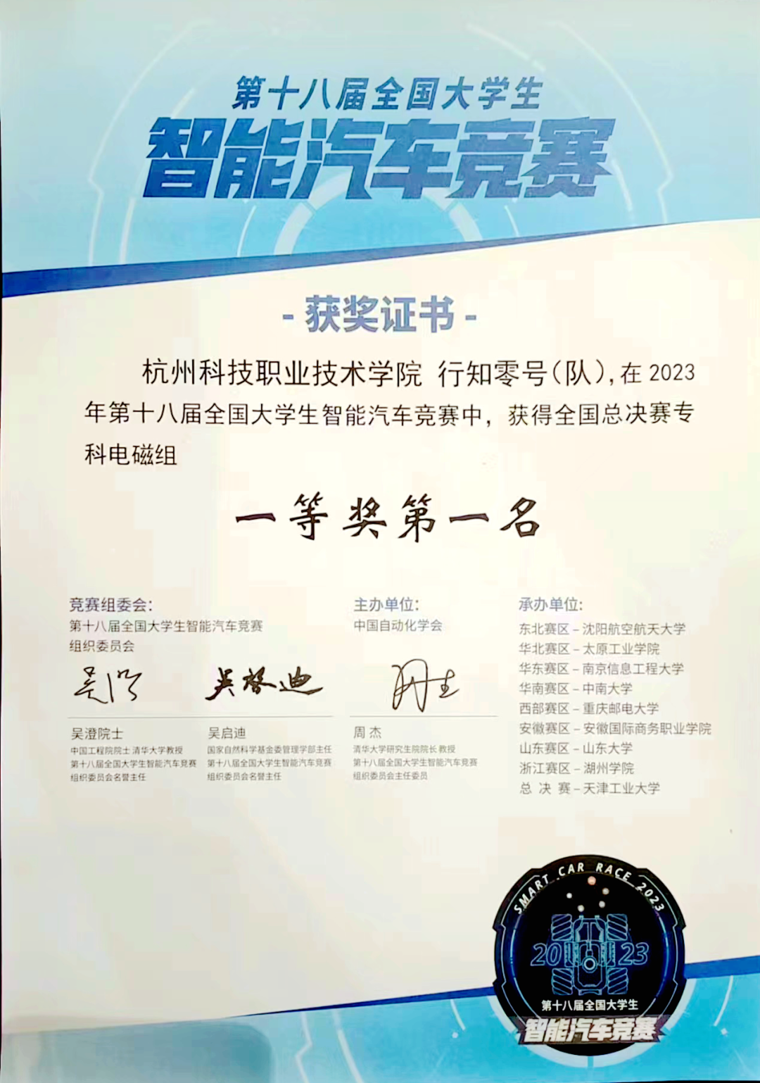 “行知零号”代表队由汽车工程学院许代文和智能制造学院翁家豪两位同学组成,汽车工程学院张朝山、徐观生两位教师共同指导。7月22日,“行知零号”代表队刚刚获得全国大学生智能汽车竞赛浙江赛区选拔赛专科电磁组一等奖,并成功晋级全国总决赛。
