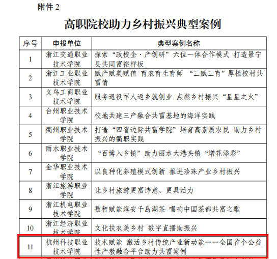 近日,浙江省教育厅发布了《关于公布第二届高校助力乡村振兴典型案例评选结果的通知》,我校《技术赋能激活乡村传统产业新动能——杭州科技职业技术学院全国首个公益性产教融合平台助力共富案例》在全省高校80余个申报案例中脱颖而出,获评高校助力乡村振兴典型案例。这是我校继2022年《组建“乡村共富”专家团队 共建“现代版富春山居图”样板区——杭州科技职业技术学院助力共同富裕示范区建设典型案例》入选教育助力乡村振兴典型案例后再次入选,我校也成为了连续两年入选该项目的5所高职院校之一。
