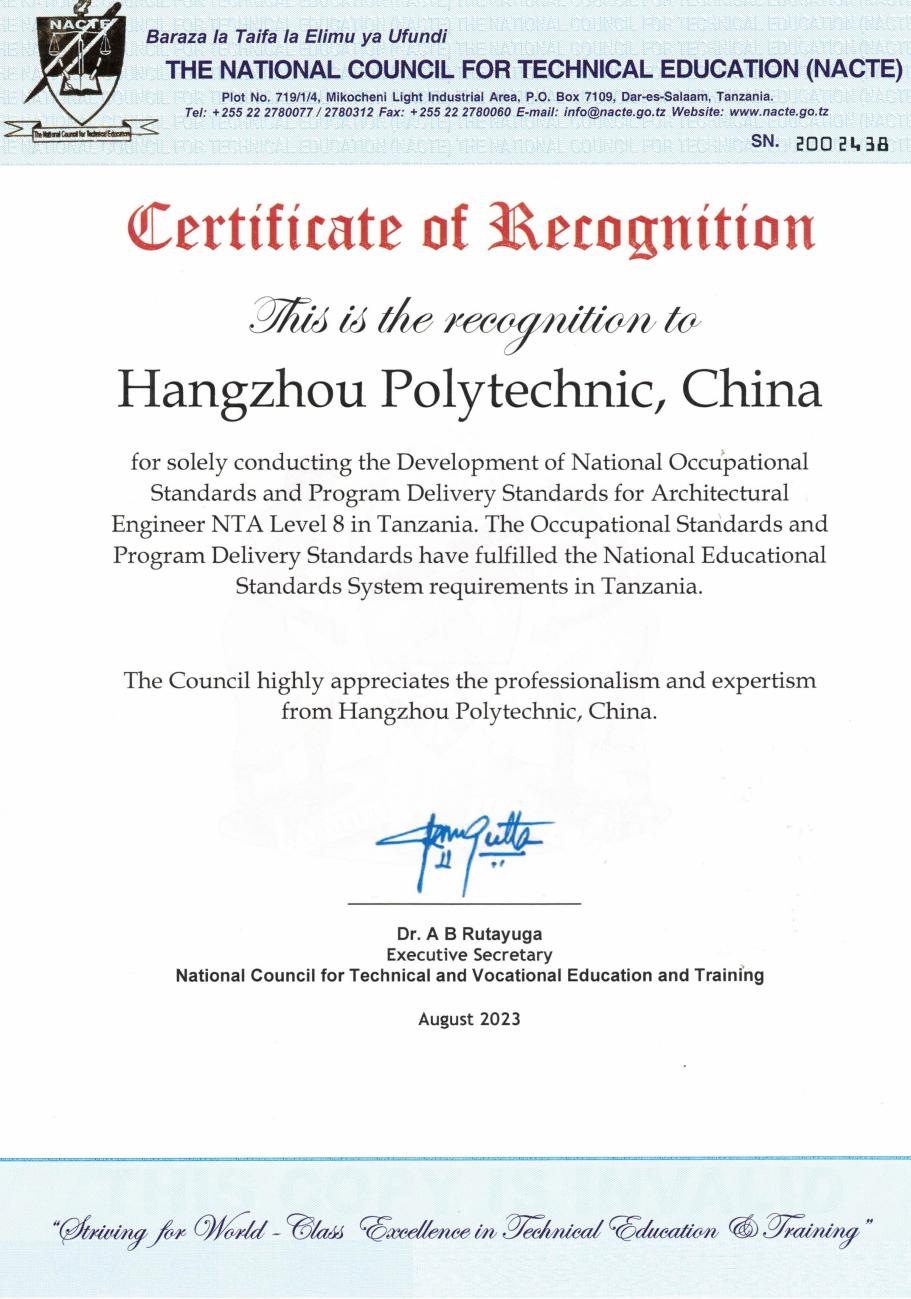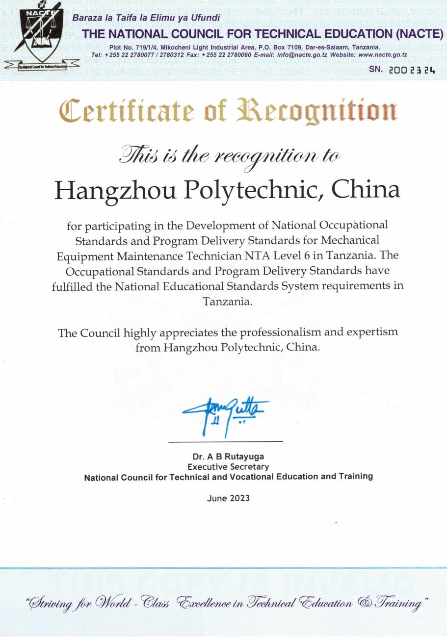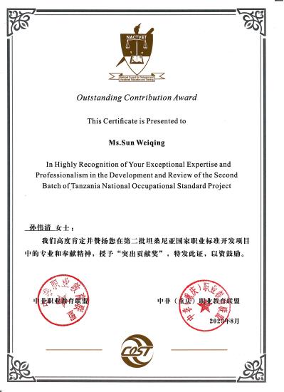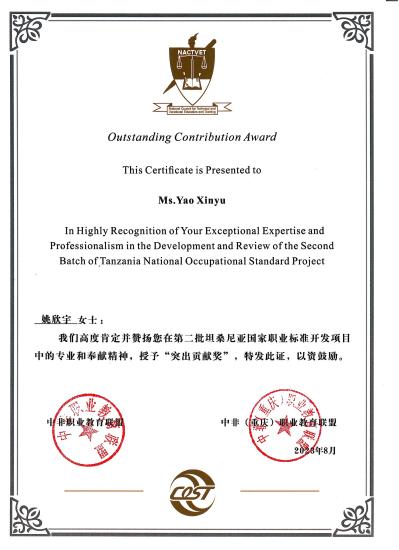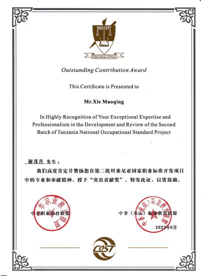 近日,由学校牵头完成的坦桑尼亚建筑工程工程师8级、人工智能技术员5级国家职业标准和配套专业教学标准,主要参编完成的坦桑尼亚机械设备维修技术员6级国家职业标准和配套专业教学标准通过了坦桑尼亚国家职业教育委员会审核,顺利获得认证,正式纳入坦桑尼亚国家职业教育体系。同时,我校6位教师获得突出贡献奖。