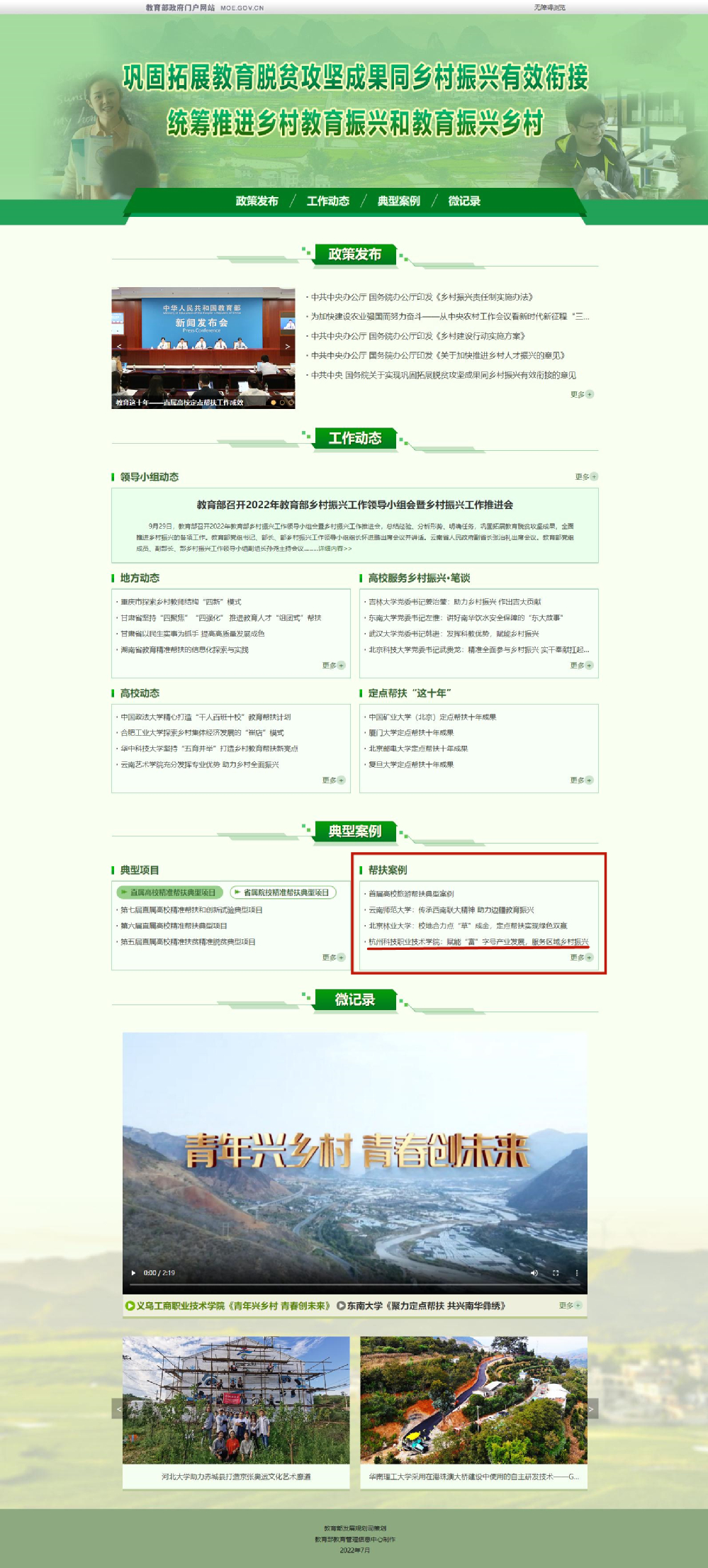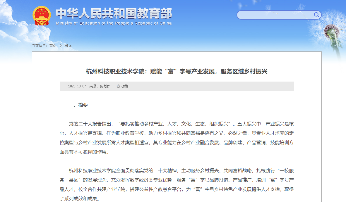 10月7日,教育部乡村振兴专题网站发布了最新一期乡村振兴典型案例。我校《杭州科技职业技术学院:赋能“富”字号产业发展,服务区域乡村振兴》案例入选,成为全国高校范围内累计入选的40项(其中职业院校共9项)案例之一。这是我校继2022年《组建“乡村共富”专家团队 共建“现代版富春山居图”样板区》案例在浙江省教育厅组织的高校助力乡村振兴典型案例评选中成功入选,并得到省教育厅推荐成为浙江省参选教育部第五届省属高等院校精准帮扶的五个典型项目之一和2023年《技术赋能 激活乡村传统产业新动能——杭州科技职业技术学院全国首个公益性产教融合平台助力共富案例》再次入选浙江省高校助力乡村振兴典型案例后的又一显著成果。