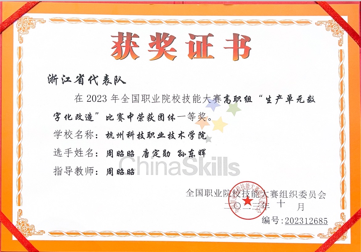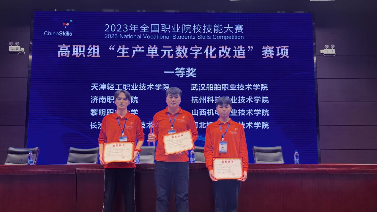 10月10日至13日,全国职业院校技能大赛生产单元数字化改造赛项在天津市举行,来自全国高职院校的84支队伍、252名师生同台竞技。我校智能制造学院周昭昭老师、唐定勋、孙东晖同学组成的代表队经过激烈角逐,拿下本次比赛浙江队的最好成绩,荣获大赛一等奖。