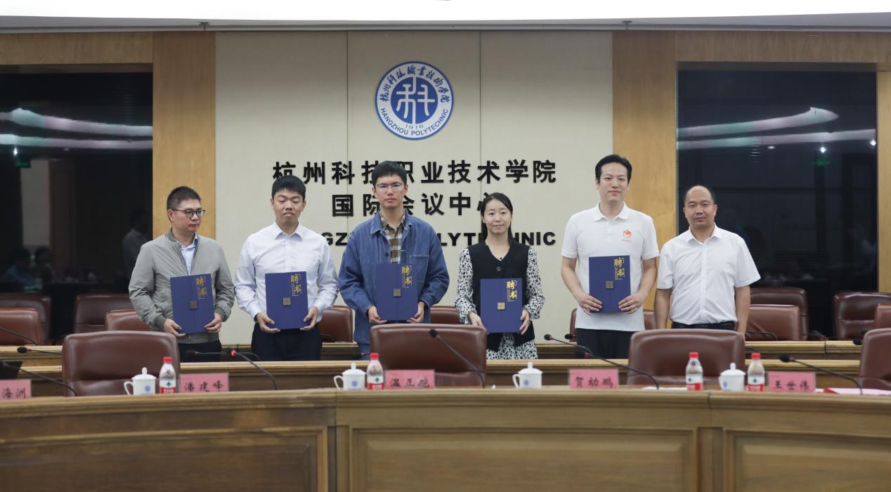 温正胞和嵊泗县职教中心党支部书记王世伟共同为“助力嵊泗海岛高质量发展中高职一体产教融合联盟”揭牌。温正胞和贺幼鹏为13位“海岛共富师徒结对”指导老师颁发聘书。