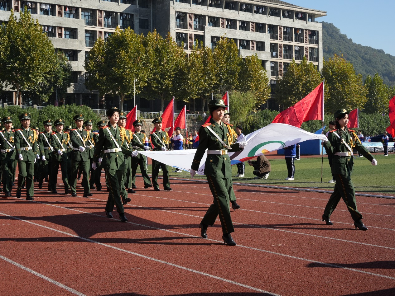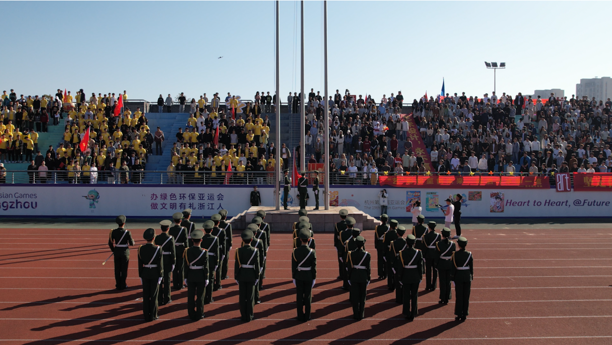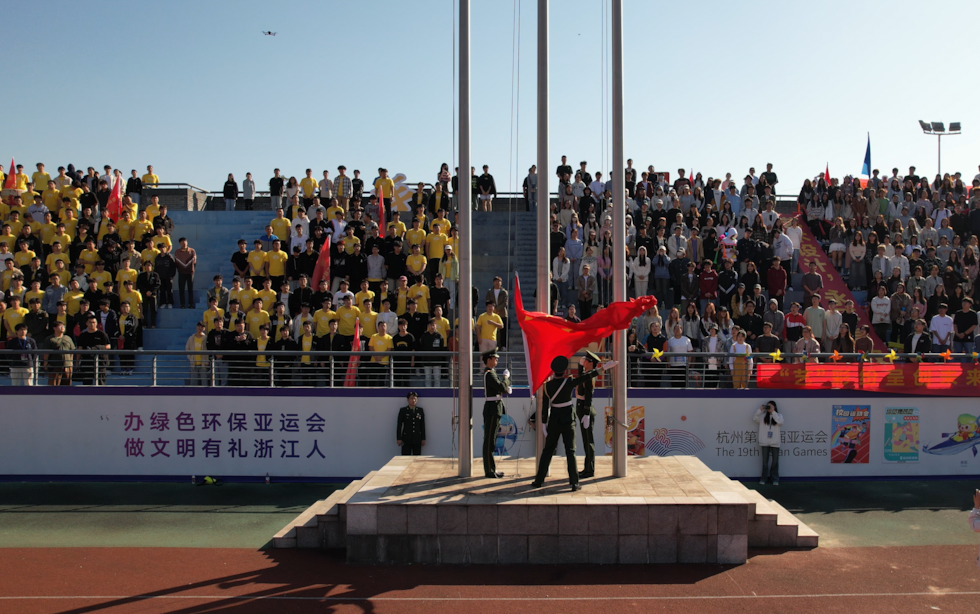 鲜艳的五星红旗在全体师生的注目下冉冉升起,彰显着杭科运动员们激情拼搏、无所畏惧的精神风貌。
