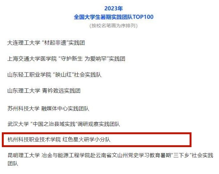 近日,“2023年第九届全国大学生暑期实践展示活动”获奖名单揭晓,我校商务管理学院“红色星火研学小分队”暑期社会实践团榜上有名,获评“2023年全国大学生暑期实践团队TOP100”。