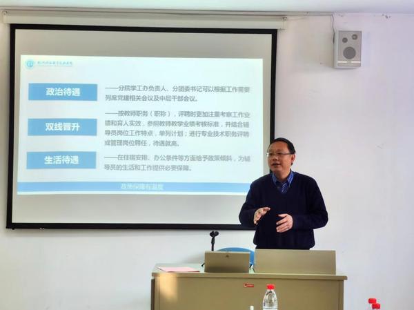 活动上,物联网技术学院党总支书记吴龙和学工部部长曲海洲分别进行了交流发言。曲海洲就辅导员的政治待遇、双线晋升和生活待遇等问题和与会人员进行了深入讨论。