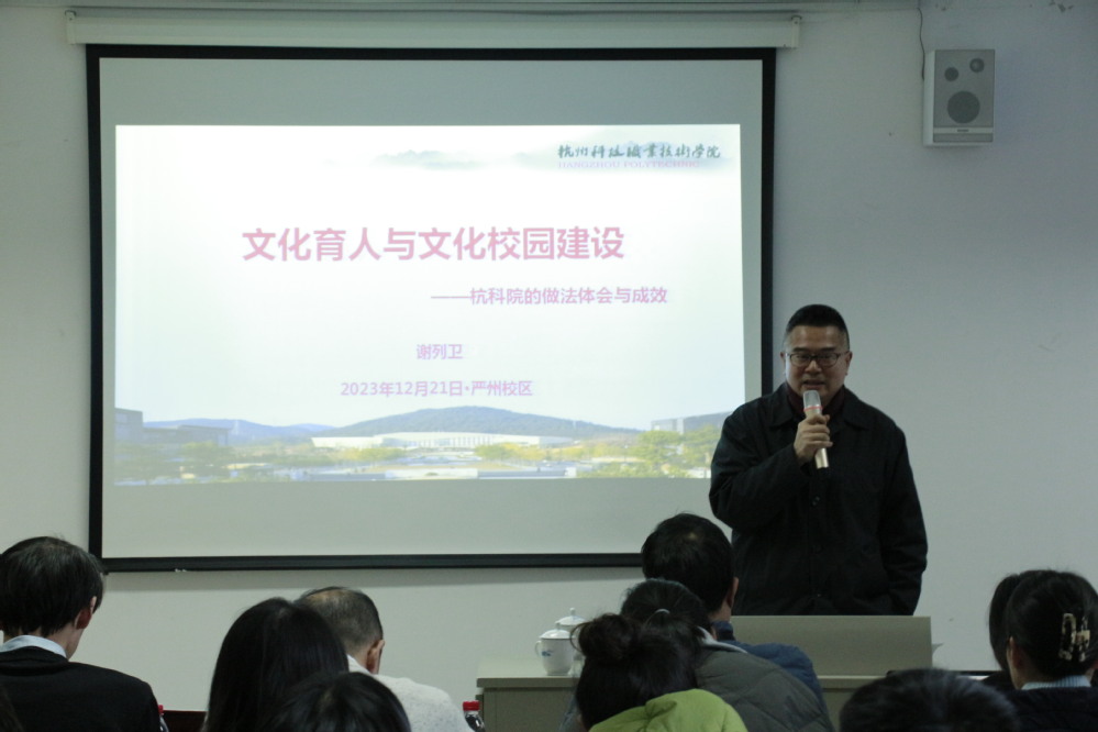 谢列卫作了《文化育人与文化校园建设——杭科院的做法体会与成效》主旨报告,详细介绍了杭科院在文化育人方面取得的显著成效,指出要更好推动学校文化建设和学生全面发展。