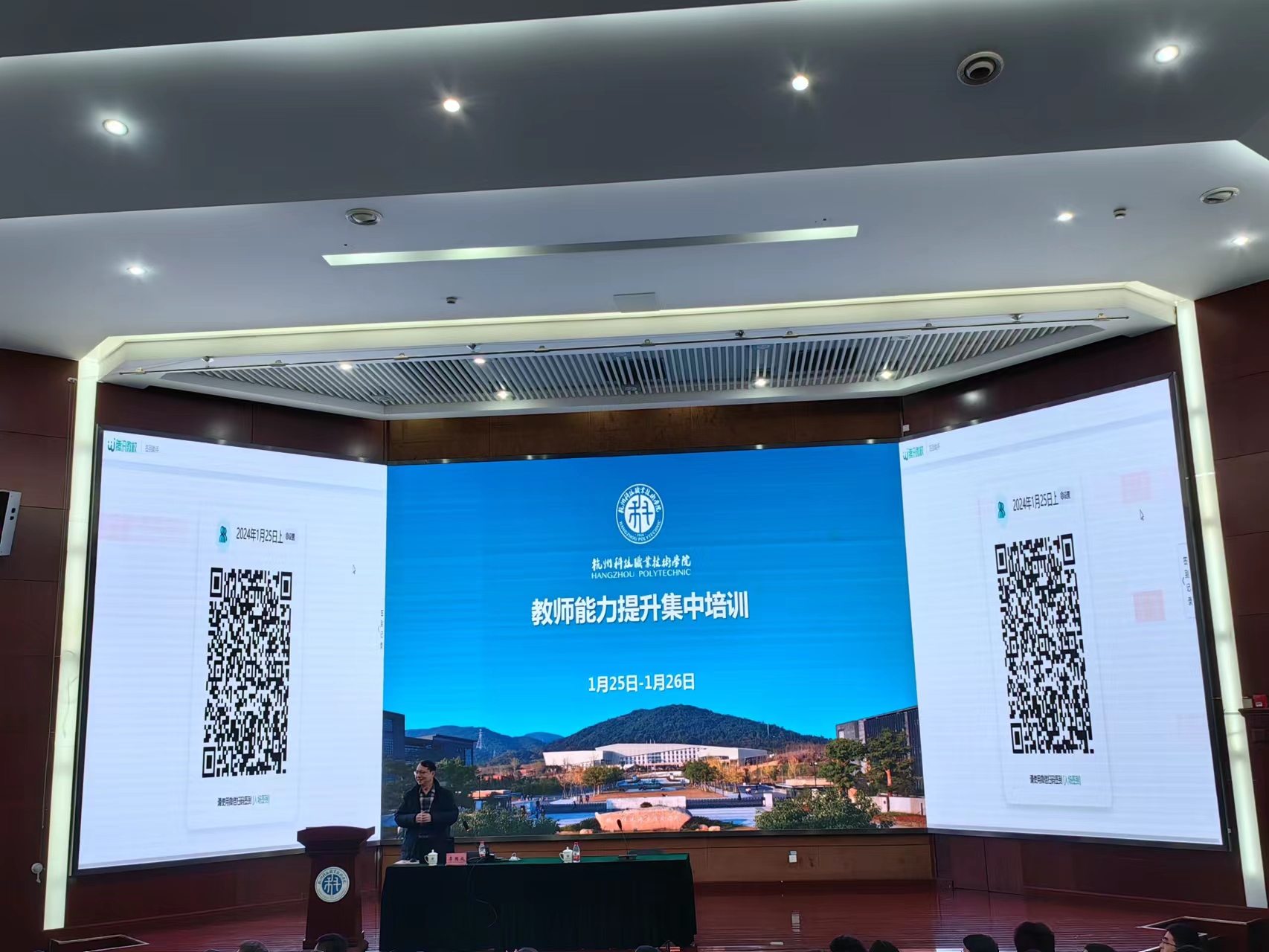 1月25日,我校2023年秋季学期期末教师能力提升集中培训班在高桥校区图书馆报告厅举行。校党委书记范朝辉出席培训会,浙江大学人工智能研究所所长吴飞教授以《Chatgpt对职业教育的影响,以及未来的应用》为主题,为全体教师做了首场专题报告。党委委员、宣传部部长、办公室主任卢杰骅,相关职能部门负责人、各二级学院(部)全体中层干部和专任教师共400余人参加学习。