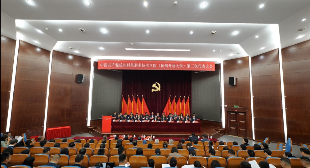 图书馆报告厅内气氛庄严热烈,主席台上方悬挂着“中国共产党杭州科技职业技术学院第二次代表大会”横幅,帷幕正中的党徽熠熠生辉,十面鲜艳的红旗分列两侧。