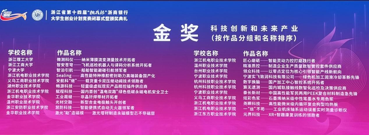 5月19日,浙江省第十四届“挑战杯”浙商银行大学生创业计划竞赛决赛在温州大学落下帷幕。经过激烈角逐,我校参赛作品勇夺金奖2项、银奖2项、铜奖5项,在省“挑战杯”赛事中获金数取得历史性突破。