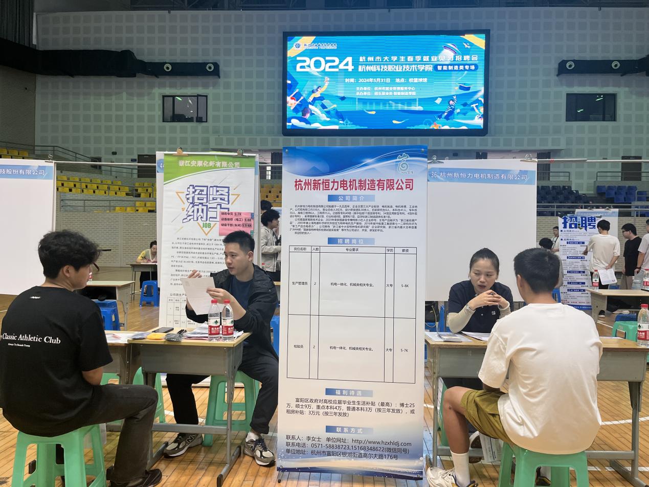 5月31日,智能制造学院与杭州市人社、富阳区人社联动发力,在高桥校区举行2024年大型招聘会,搭建2025届毕业生与企业面对面交流的平台,吸引了58家企业参与,提供了近600个岗位。党委书记范朝辉,党委委员、副校长赵悦林来到招聘会现场指导工作,学工部部长曲海洲、智能制造学院党总支书记陈韵雯、副院长(主持工作)谢茂青、党总支副书记张学良等一起为毕业生们加油鼓劲。