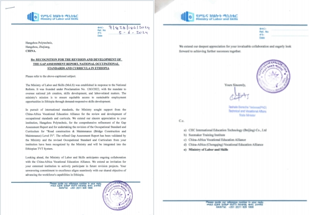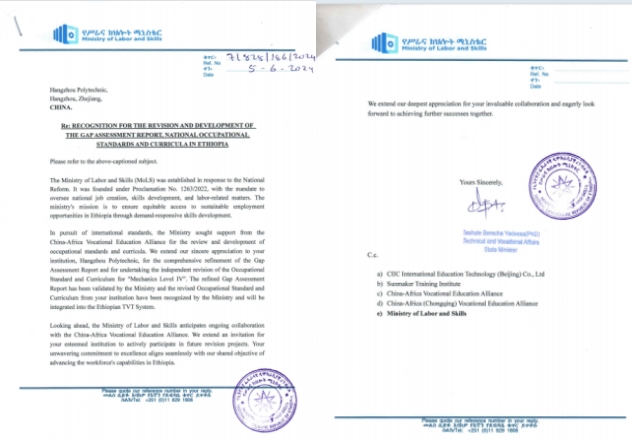 埃塞俄比亚国家职业标准建设项目于2023年4月正式立项,教务处牵头组织,相关学院组建项目建设工作组。经过多轮沟通研讨、修订开发、中埃塞双方专家审校等开发与制定工作,我校牵头开发的2个职业标准最终通过埃塞俄比亚劳动与技能部审核和认证,将指导埃塞俄比亚职业院校开展人才培养工作。