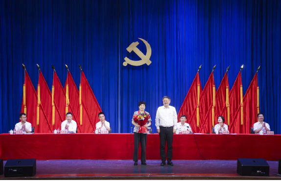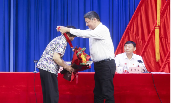 大会举行了“光荣在党50年”纪念章颁发仪式。范朝辉为老党员代表郑美金颁发纪念章,学生代表上台敬献鲜花,向老党员同志50年与党同行的光辉岁月致以崇高的敬意和真挚的问候。