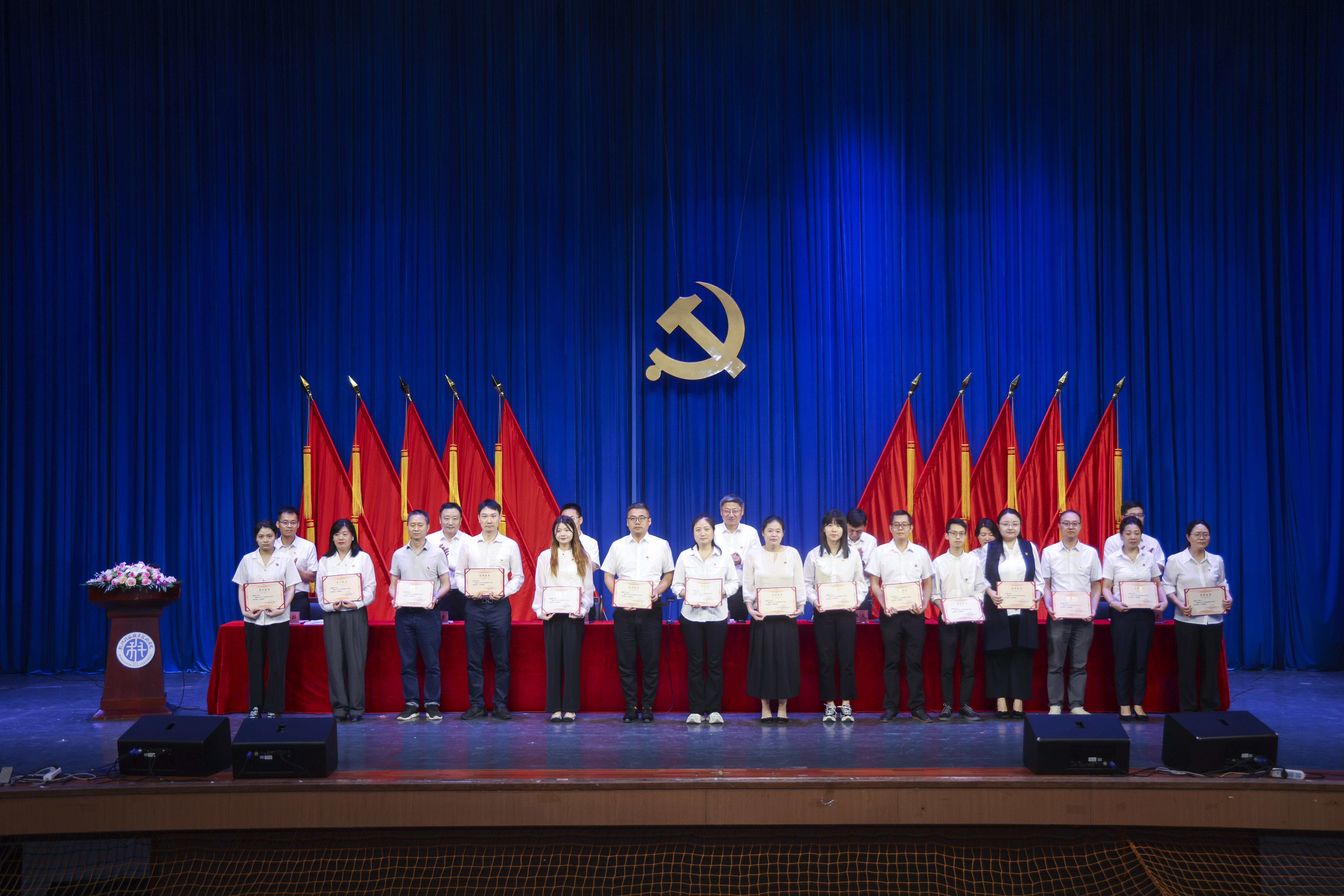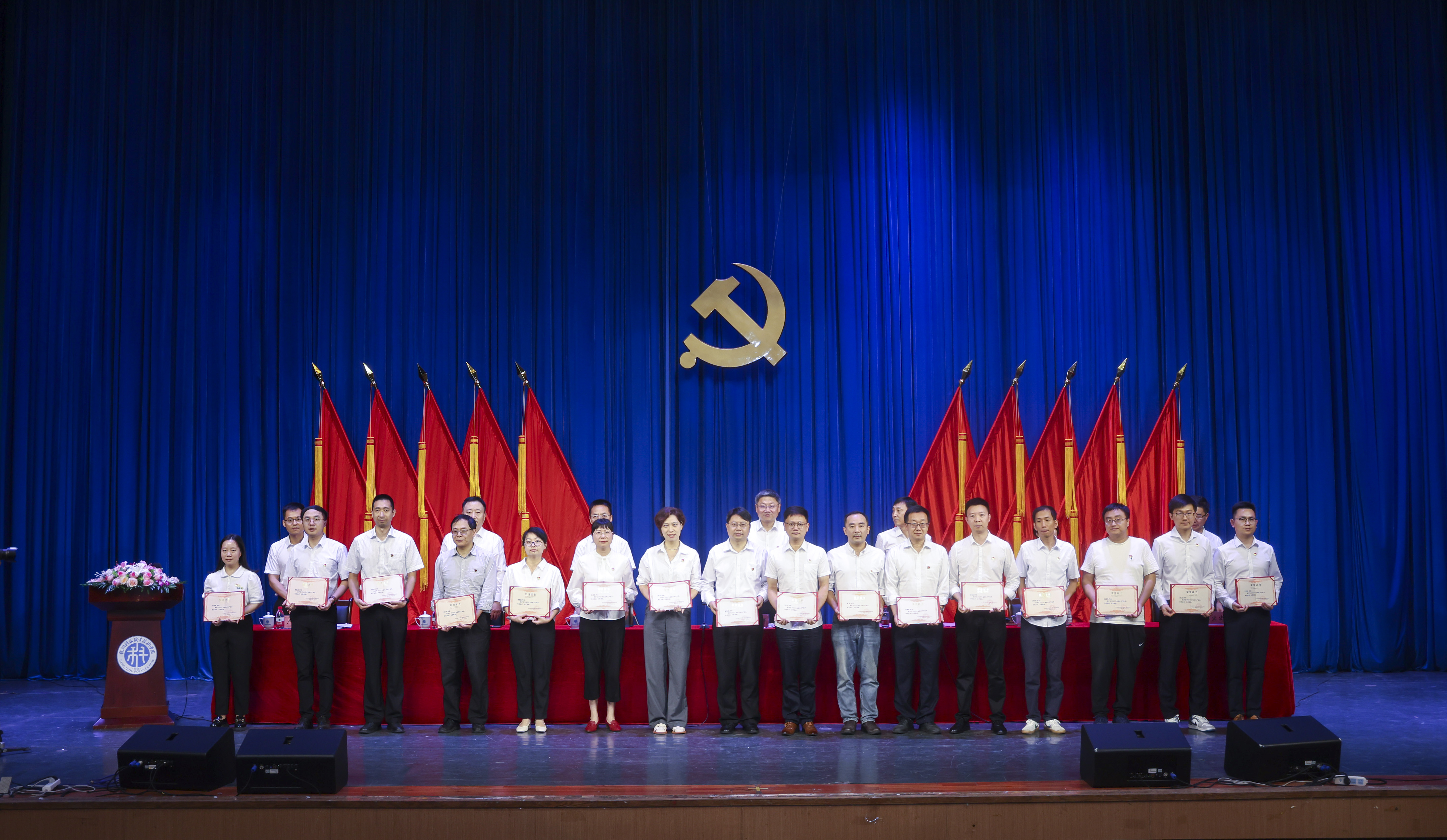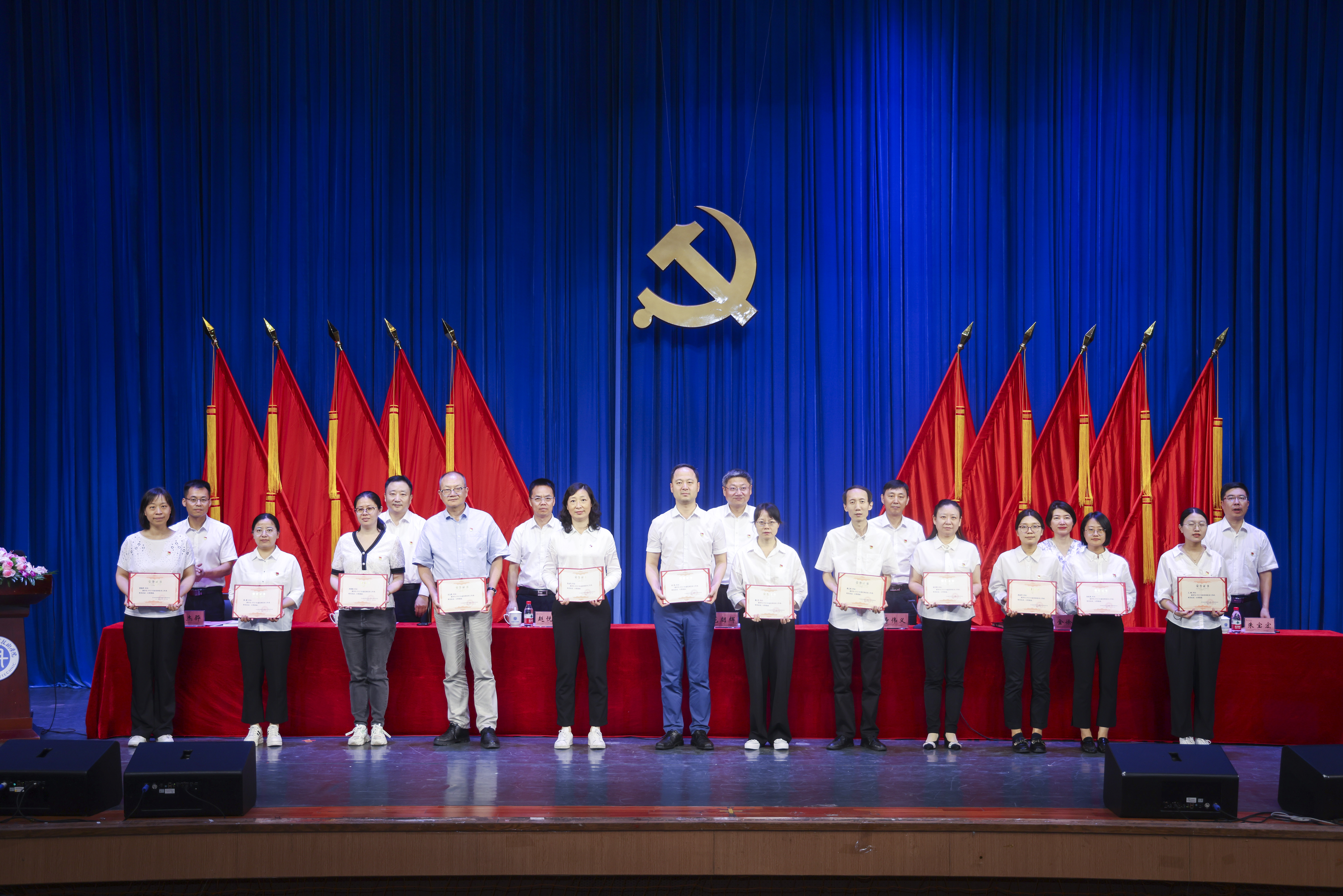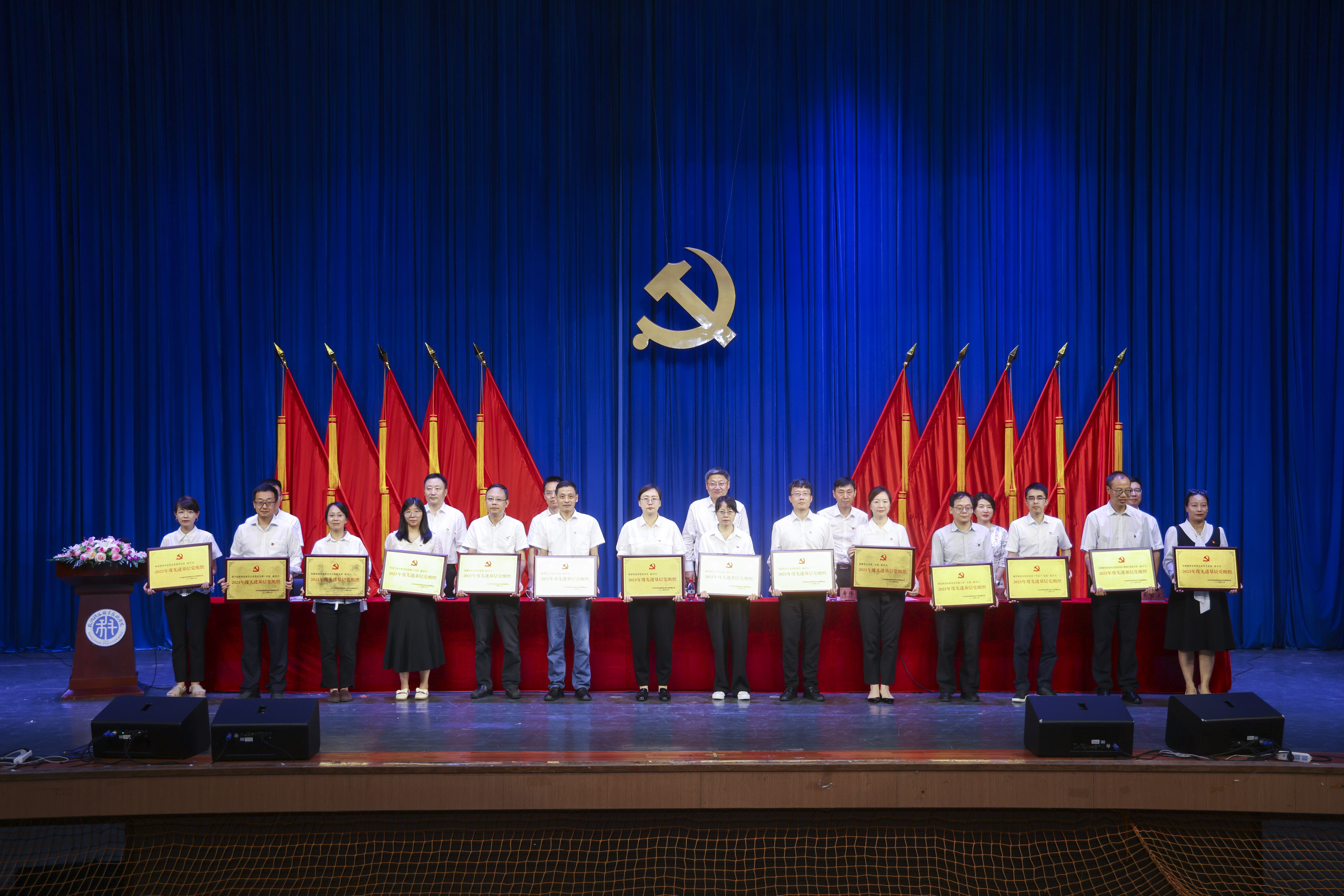 大会宣读表彰文件,党委班子成员为2023年度市教育系统优秀共产党员、市教育系统优秀党务工作者、市教育系统先进基层党组织、校级优秀共产党员、校级优秀党务工作者、校级先进基层党组织颁发荣誉证书和授牌。