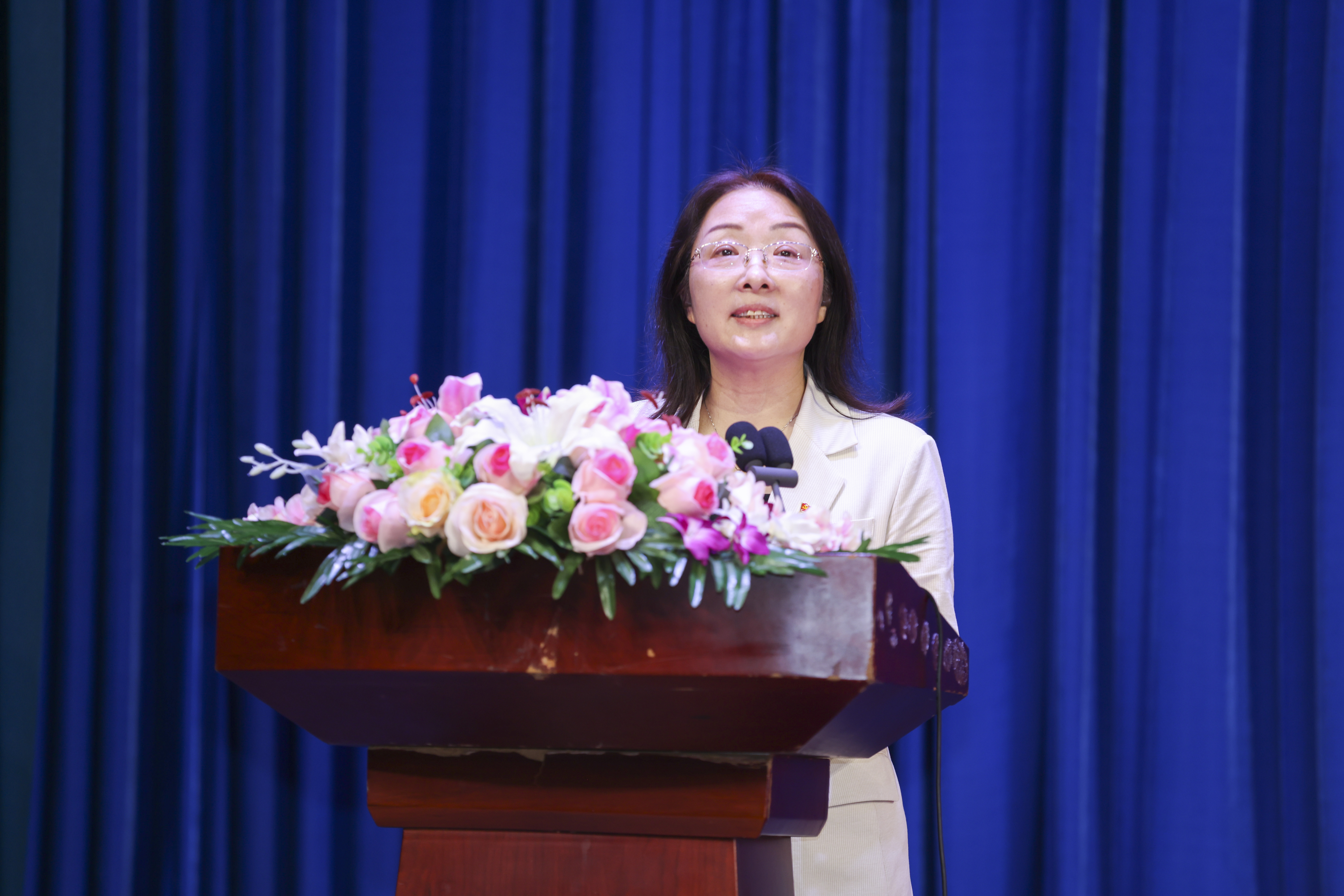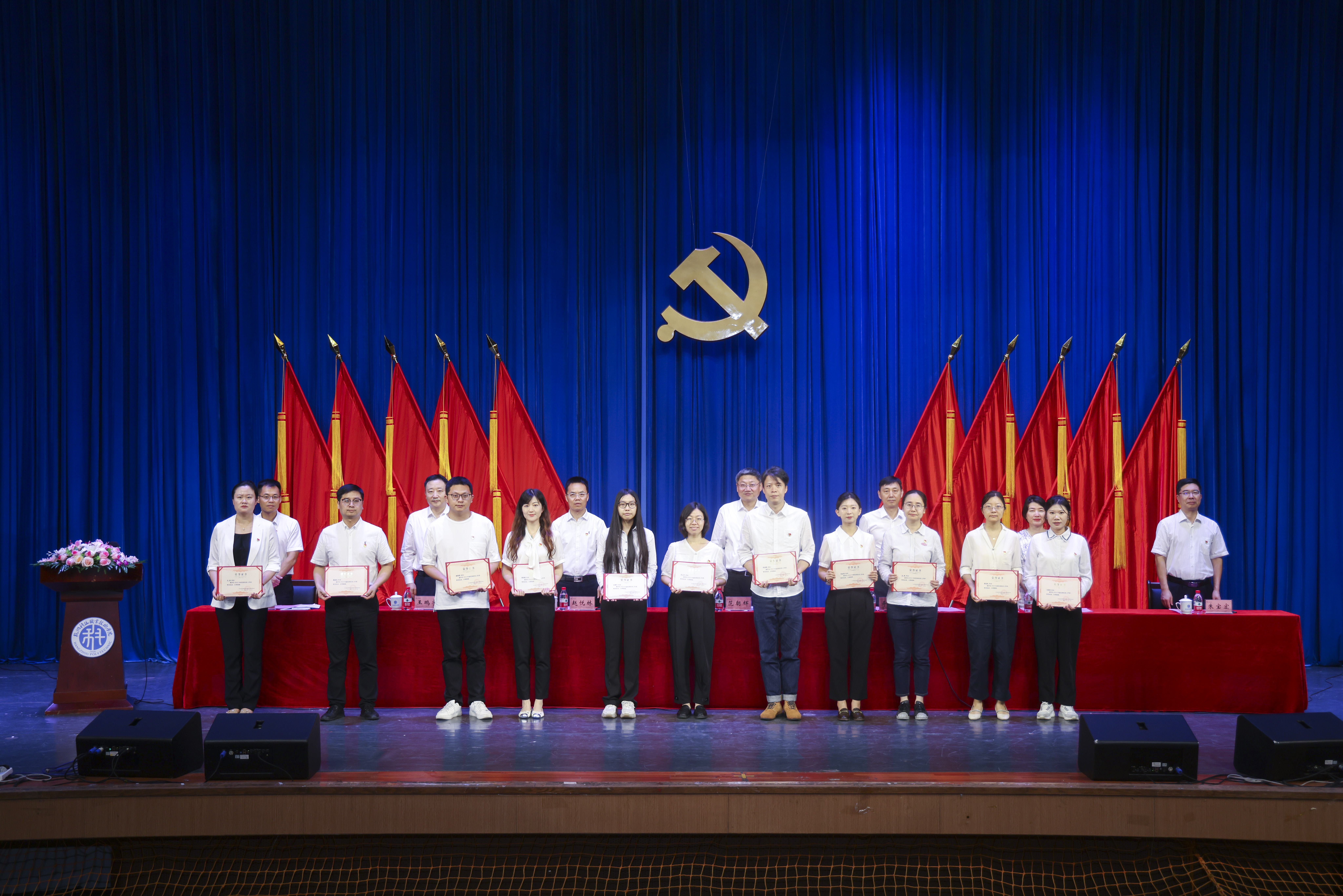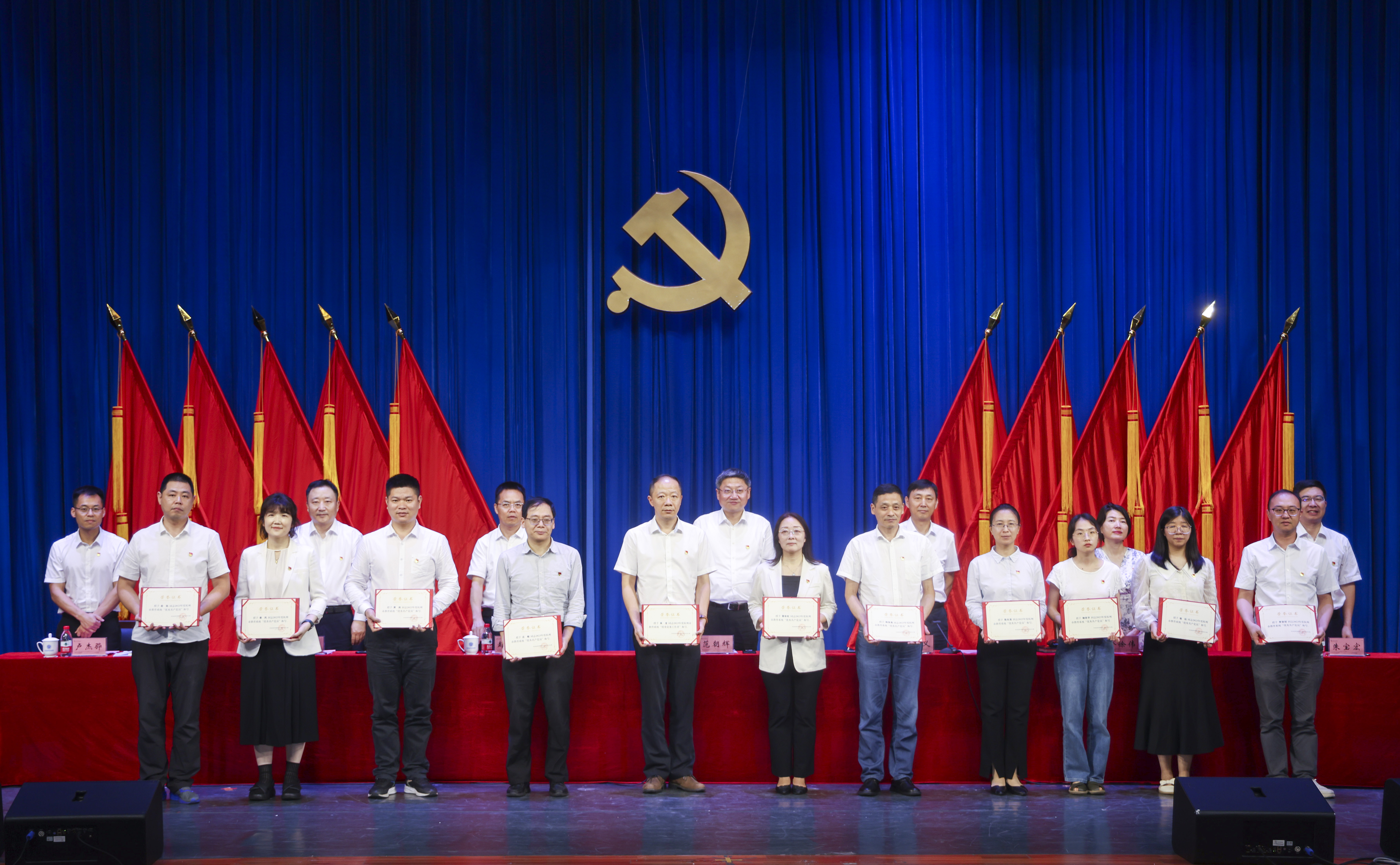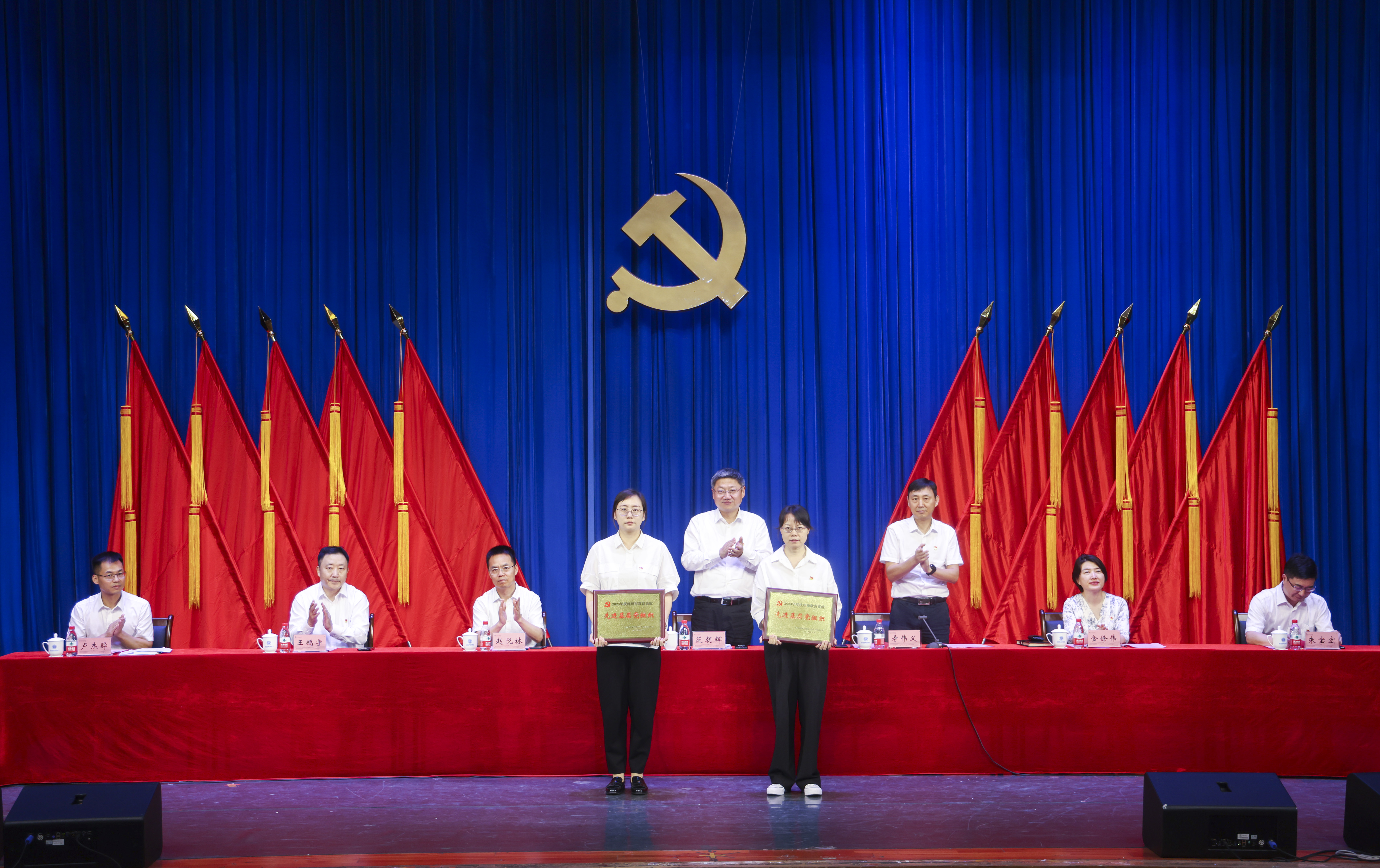 大会宣读表彰文件,党委班子成员为2023年度市教育系统优秀共产党员、市教育系统优秀党务工作者、市教育系统先进基层党组织、校级优秀共产党员、校级优秀党务工作者、校级先进基层党组织颁发荣誉证书和授牌。