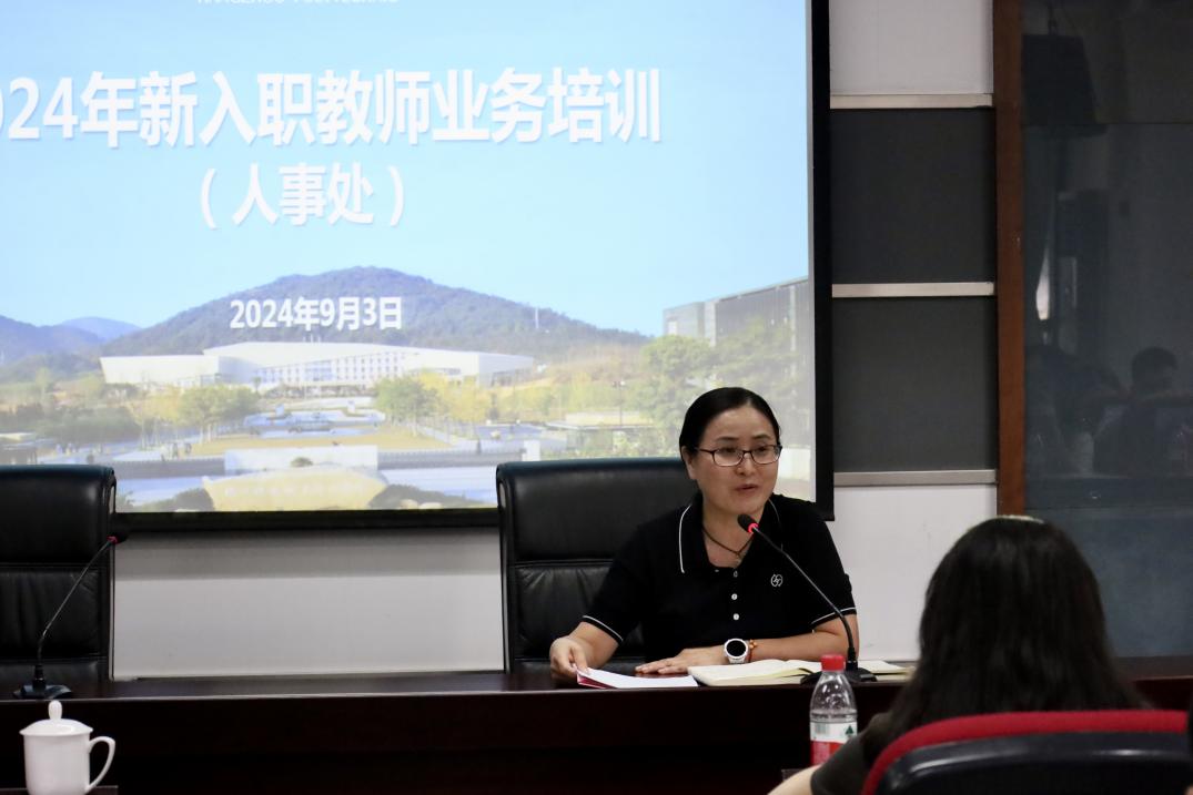 “热烈欢迎各位新‘杭科人’加入杭科院大家庭”,范朝辉为新入职教师全面介绍了学校的历史文脉和办学情况,生动解读了学校“一训三风”的深刻内涵,深入讲解了学校“人才强校”战略的发展建设,并结合《新时代高校教师职业行为十项准则》叮嘱新教师们严守师德师风。