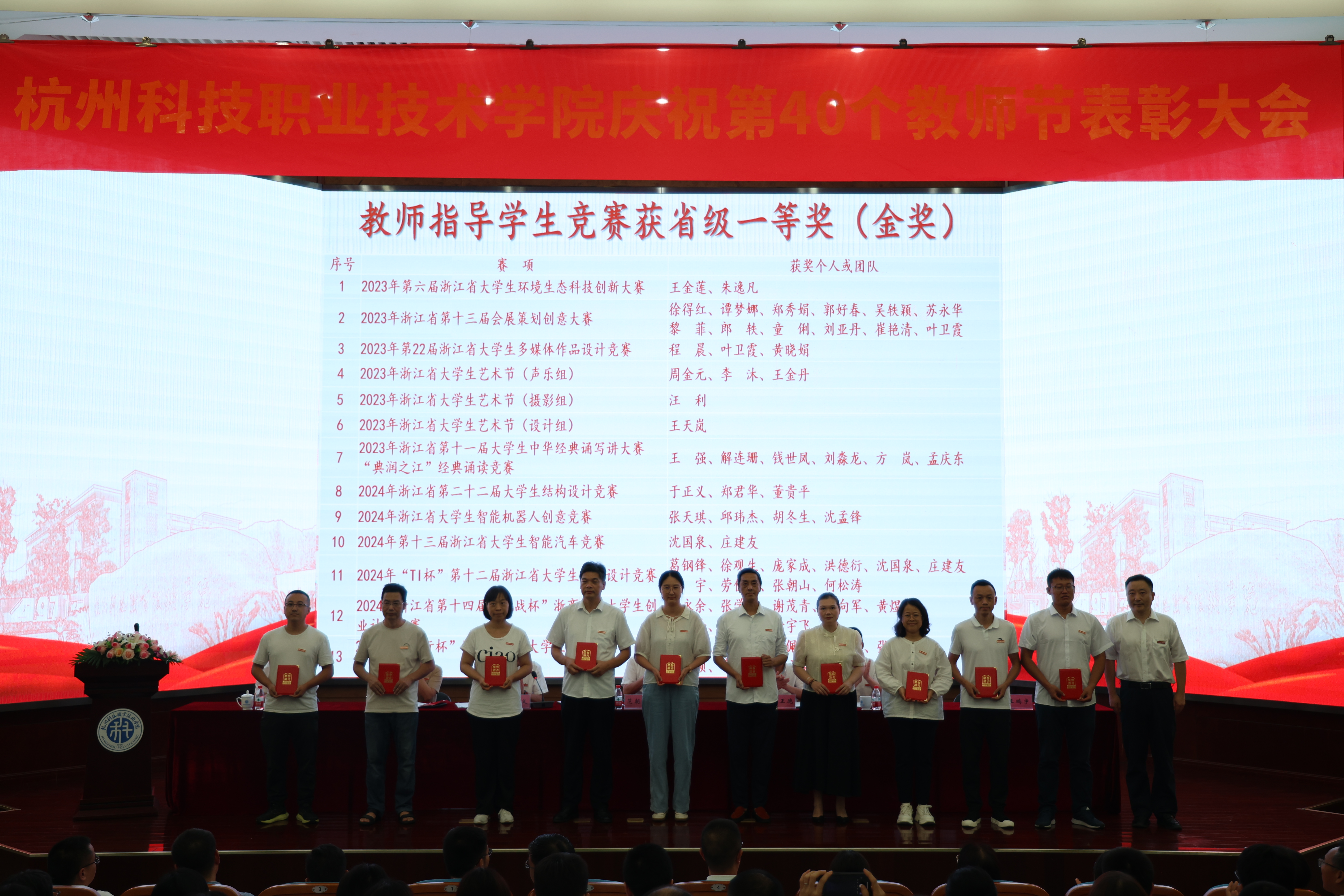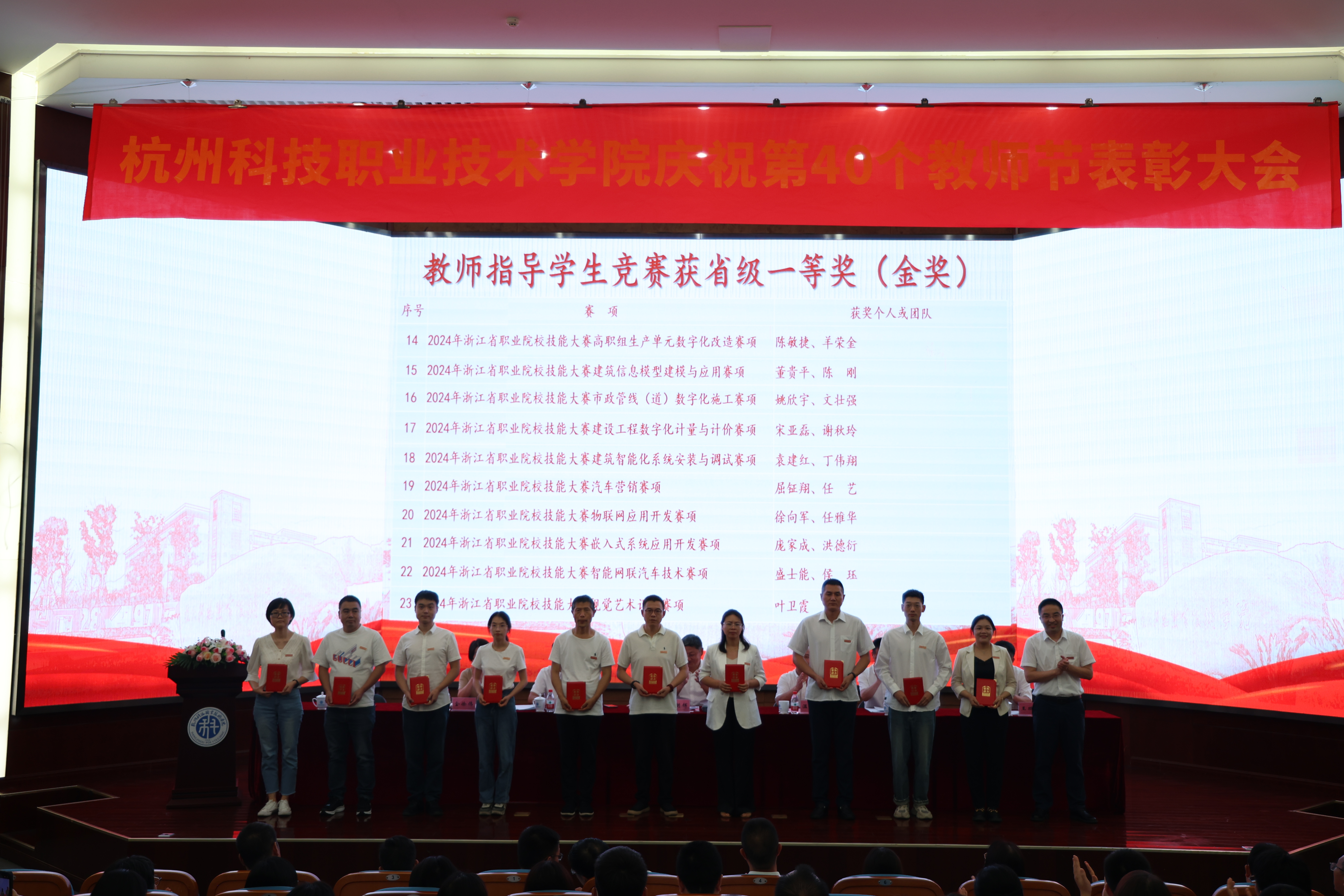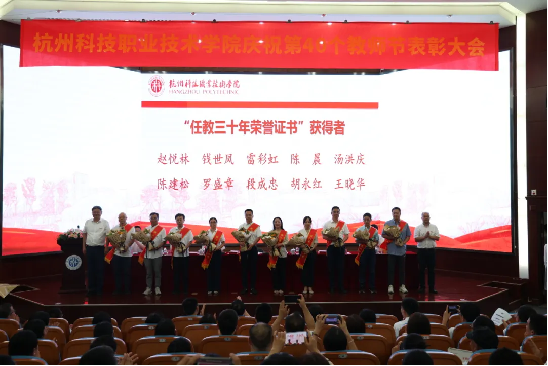 表彰大会上,获得“任教三十年荣誉证书”教师代表陈晨,杭州市优秀教育工作者、教育工匠范大波,杭州市教育青年人才、系统级优秀教育工作者沈孟锋,校“三育人”先进个人洛亮亮,校优秀辅导员张曼,学生技能竞赛优秀指导教师黄煜栋,新入职教师代表付倩倩分别作为教师代表发言。全体2024年新入职教师在人事处教师李腾飞的领誓下,进行了庄严的入职宣誓。教师节当天,学校还为全体教师举行了亮灯行动。