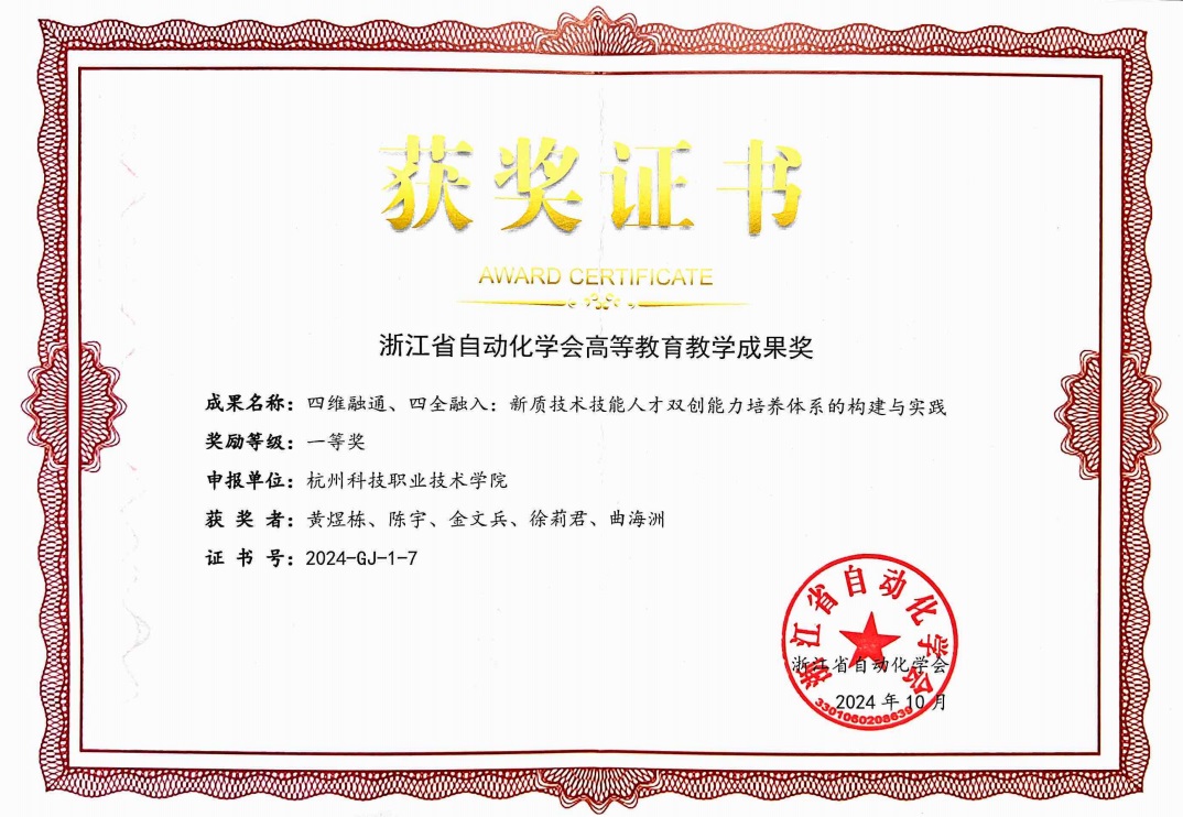 近日,2024年浙江省自动化学会高等教育教学成果奖评审工作落下帷幕。经专家评审委员会评审,我校物联网技术学院教师黄煜栋教授主持的“四维融通、四全融合:新质技术技能人才双创能力培养体系的构建与实践”成果荣获2024年浙江省自动化学会高等教育教学成果奖一等奖。我校也是浙江省内唯一获奖的高职院校。