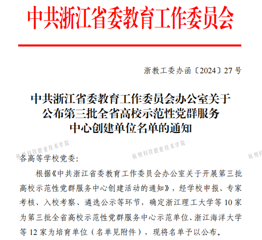 近日,浙江省教育工委公布了第三批全省高校示范性党群服务中心创建单位名单,共确定10家高校为示范单位、12家高校为培育单位,我校入选为培育单位。
