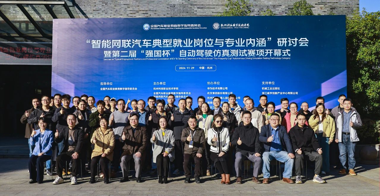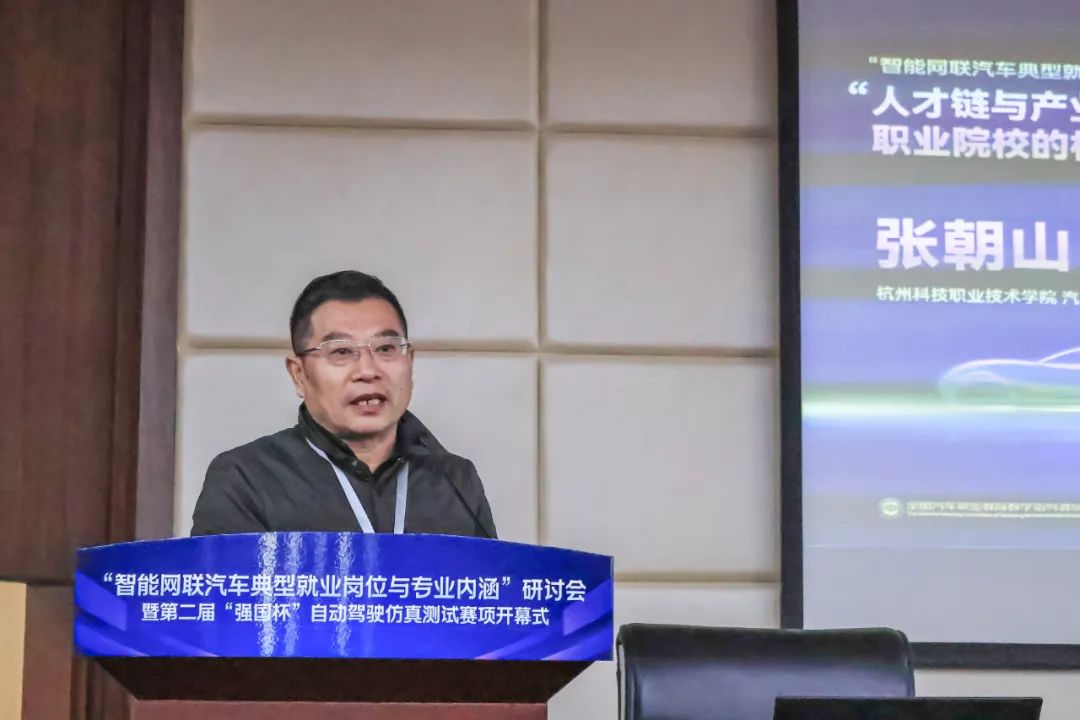 比赛期间,一场以“智能网联汽车典型就业岗位与专业内涵”为主题的研讨会同步举行。来自职业院校、行业企业以及出版社的领导嘉宾齐聚一堂,围绕六大核心议题要点,分别发表精彩主题演讲,共同深入探讨在产业转型升级与高质量发展进程中涌现出的新技术、新场景、新岗位以及新内涵。汽车工程学院院长张朝山举行了一场别开生面的讲座,讲座紧密结合当前汽车产业地位显著提升、格局深度重塑、新能源汽车迅猛加速发展以及智能化加速落地的产业链现状,考量汽车技术专业人才极度紧缺的人才链现状,深入剖析了智能网联汽车专业职业教育面临的独特机遇与严峻挑战,并以杭州科技职业技术学院汽车工程学院的教学实践为范例,深度探讨了汽车专业人才培养的创新模式。