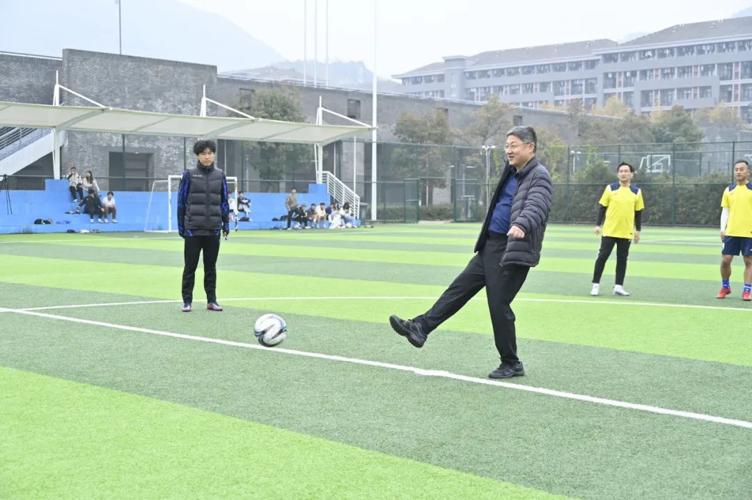 12月7日下午,“校地协同 共育人才”上城区机关足球队与杭科院教工足球队友谊赛在我校高桥校区开赛。党委书记范朝辉为比赛开球,上城区政协副主席洪明出席并带队参赛。