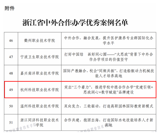 近日,浙江省教育厅公布了2024年中外合作办学优秀案例名单,经全省高校申报、省教育厅组织评议,共确定51个中外合作办学优秀案例(其中高职22个)。我校申报的《突出“三个着力”,推进学校中德合作办学“党建引领+思政润心+数字赋能”品牌建设》成功入选。