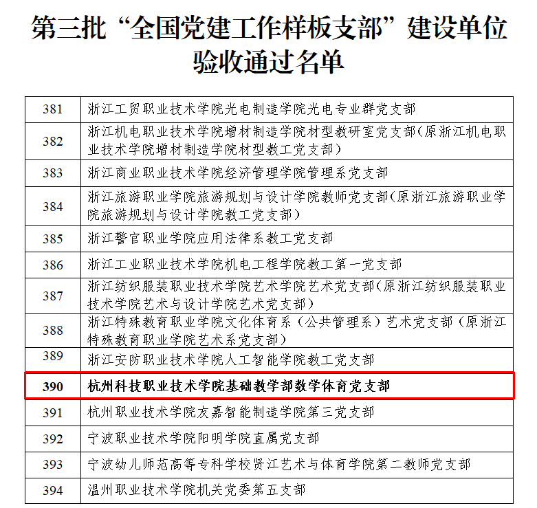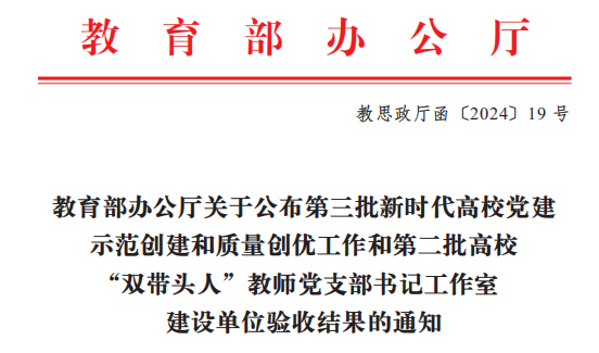 近日,教育部办公厅公布了第三批新时代高校党建示范创建和质量创优工作和第二批高校“双带头人”教师党支部书记工作室建设单位验收结果名单,我校基础教学部数学体育党支部顺利通过第三批“全国党建工作样板支部”建设单位验收。