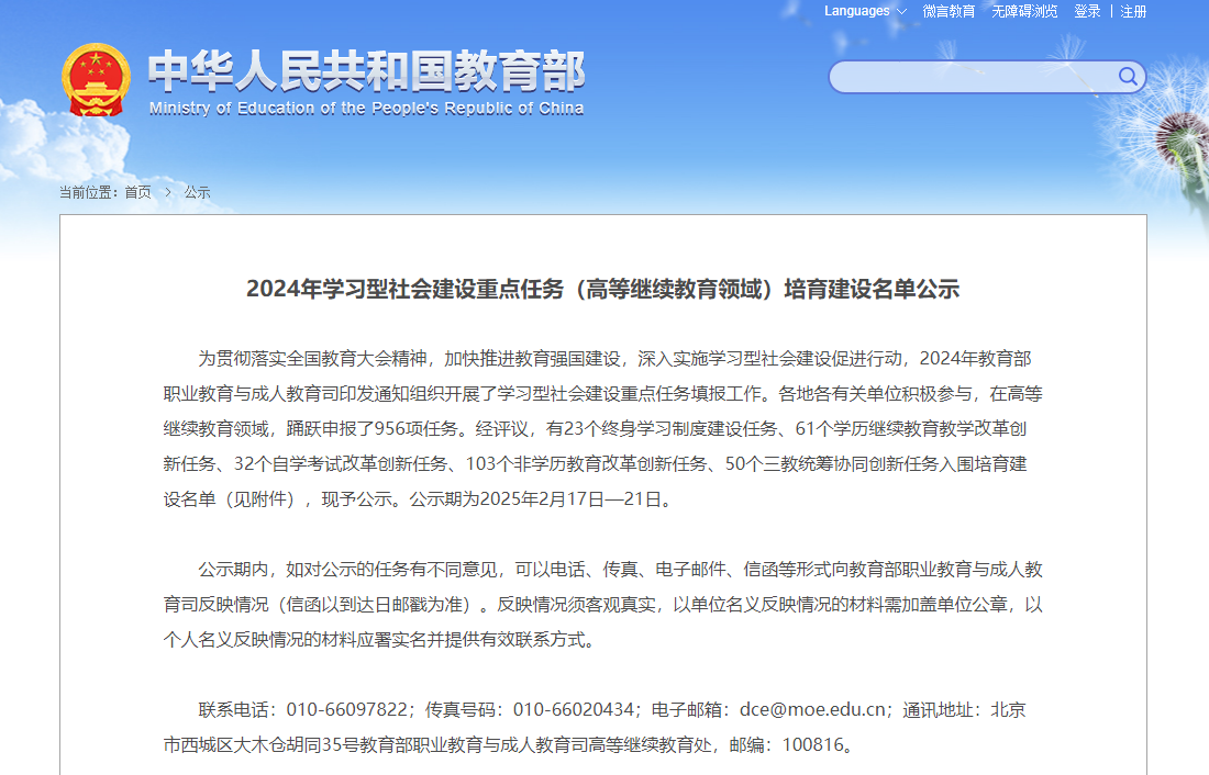 近日,教育部公示《2024年学习型社会建设重点任务(高等继续教育领域)培育建设名单》,我校《非学历教育数字治理创新实践》脱颖而出,入围非学历教育改革创新任务培育建设名单。