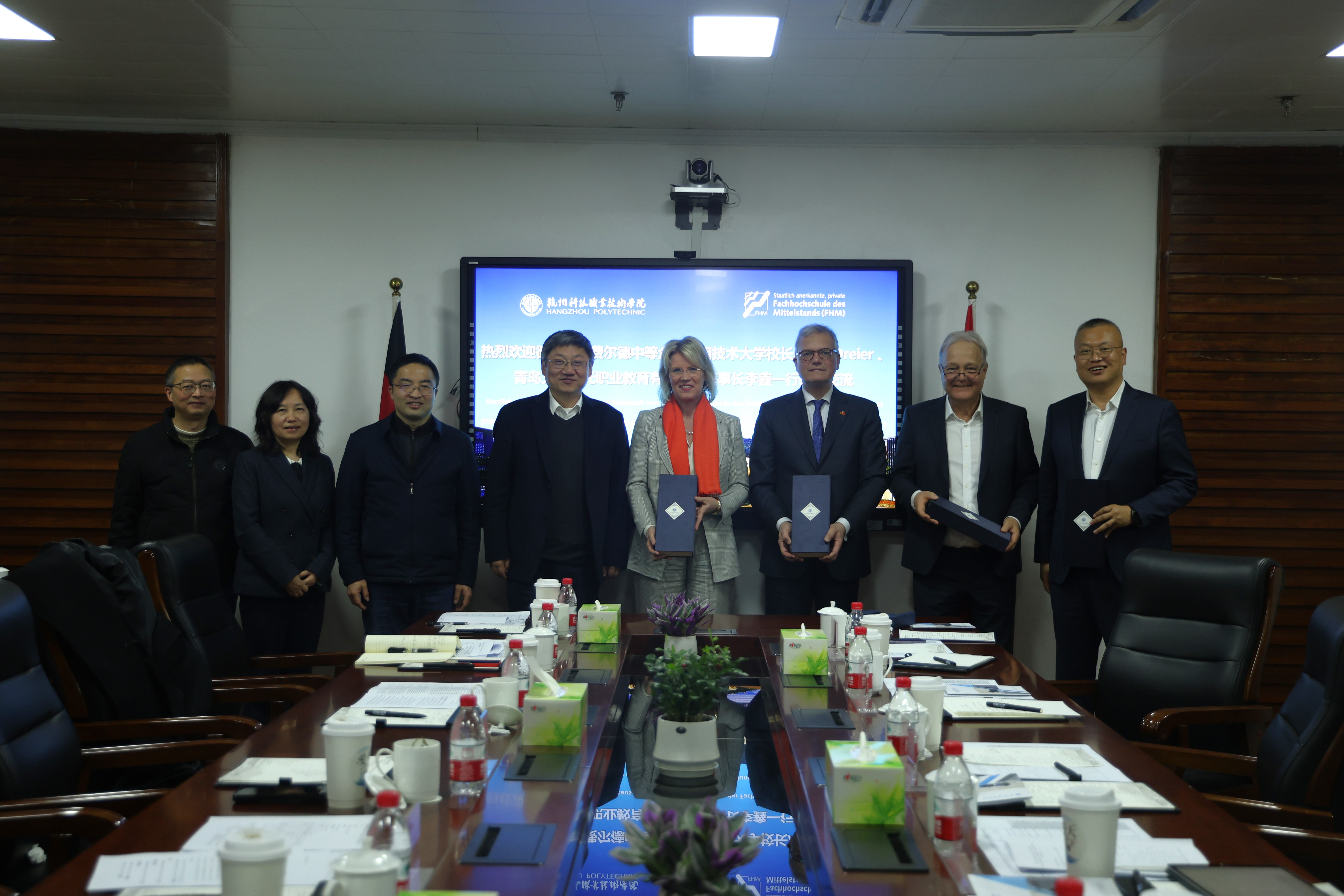 2月25日,德国比勒费尔德中等企业应用技术大学校长安妮·德雷尔、青岛艾瑞双元职业教育有限公司董事长李鑫一行到校访问。党委书记范朝辉、校长温正胞出席洽谈会。办公室(外事办)、国际教育处、教务处、招生就业处、智能制造学院、艺术设计学院相关负责人参加。会议由党委委员、副校长潘建峰主持。