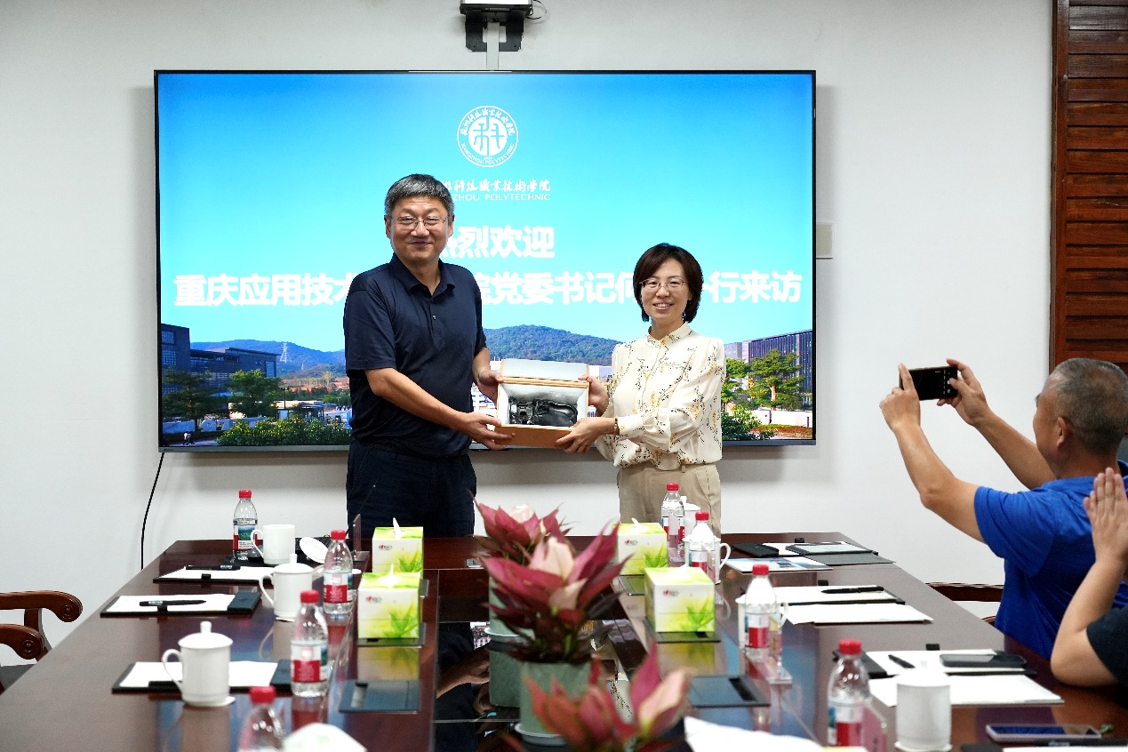 会后,何菲书记代表重庆应用技术职业学院向杭科院赠送合川非遗工艺品“峡石砚”。 考察团一行参观了高桥校区中轴线文化景观带、校史馆、陶研馆。