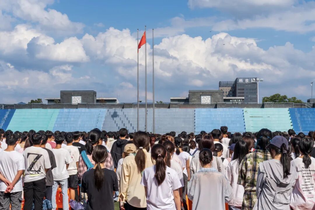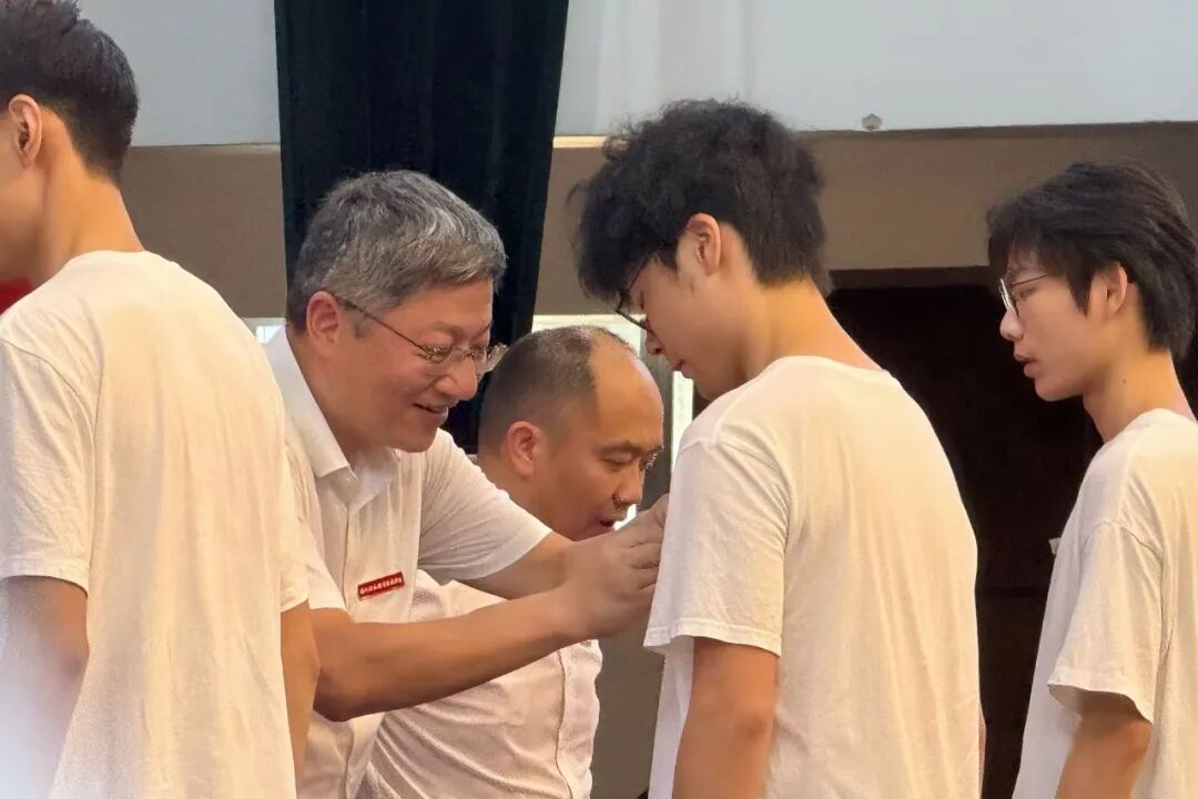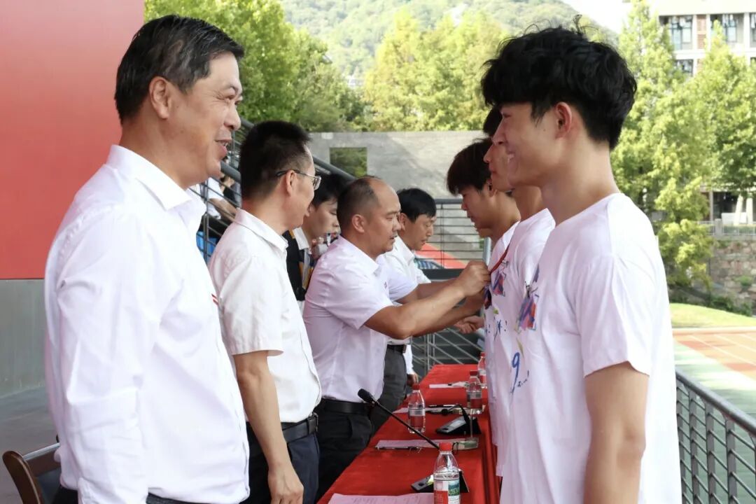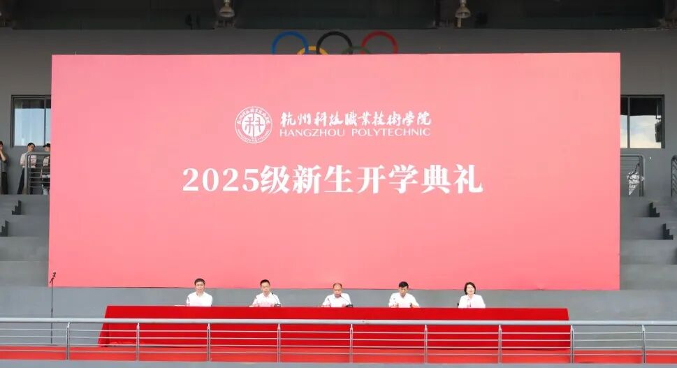在庄严的升旗仪式后,开学典礼正式开始。范朝辉、温正胞等校领导为新生代表佩戴校徽。来自全国7个省(自治区)的5100余名2025级高职新生戴上崭新的校徽,正式开启了在杭科院的大学生活。