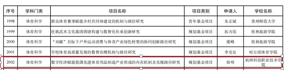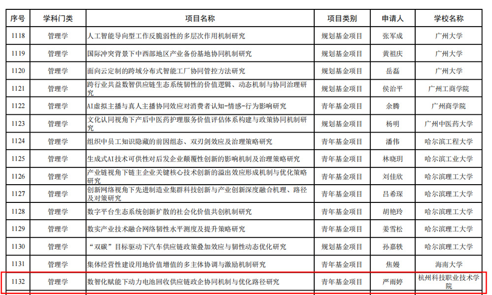 我校商务管理学院严雨婷老师申报的课题《数智化赋能下动力电池回收供应链政企协同机制与优化路径研究》获批青年基金项目立项、基础教学部徐明老师申报的课题《数字经济赋能我国先进体育用品制造产业形成的内在机制及实现路径研究》获批规划基金项目立项、马克思主义学院吴太胜老师申报的课题《“大思政”格局下大中小学思政课核心素养一体化评价体系构建研究》获批高校思想政治理论课教师研究专项教学研究项目立项。