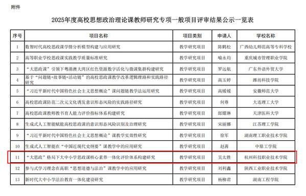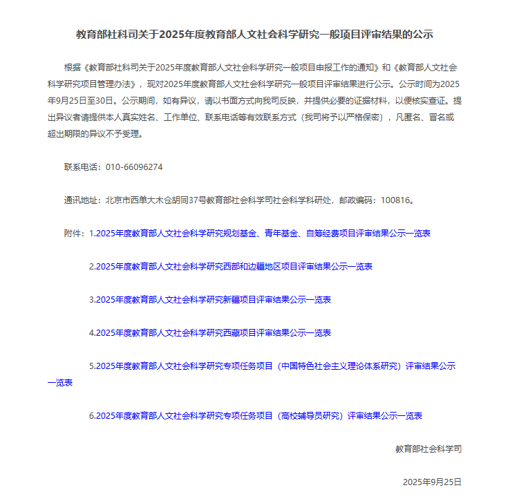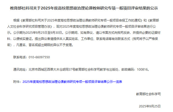 9月25日,教育部社科司发布了《关于2025年度教育部人文社会科学研究一般项目评审结果的公示》和《关于2025年度高校思想政治理论课教师研究专项一般项目评审结果的公示》,我校共立项3项课题。