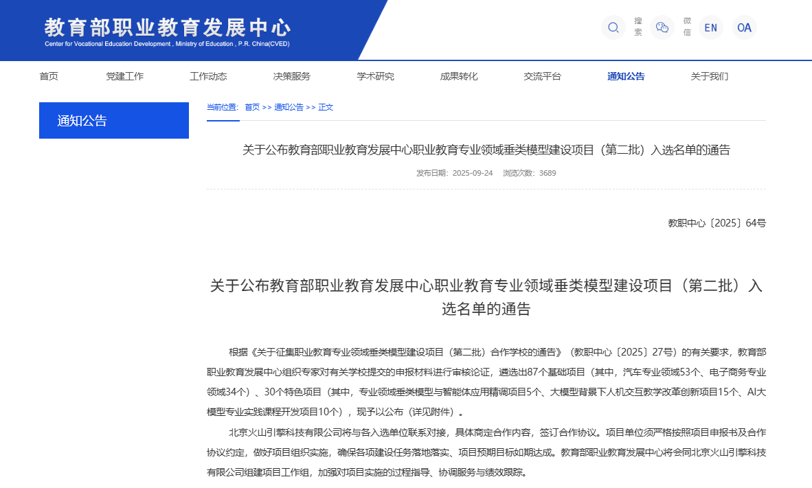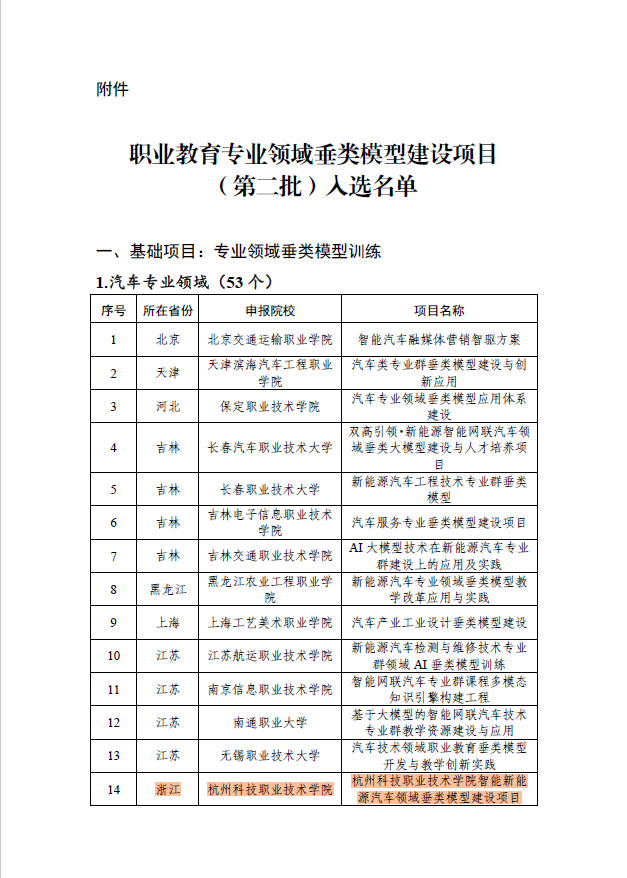 近日,教育部职业教育发展中心正式公布了职业教育专业领域垂类模型建设项目第二批入选院校名单。经过严格遴选,我校凭借在智能新能源汽车领域的扎实基础、鲜明特色和突出优势,成功入选该建设项目名单。此次全国汽车专业领域共有53所高职院校入选第二批名单。