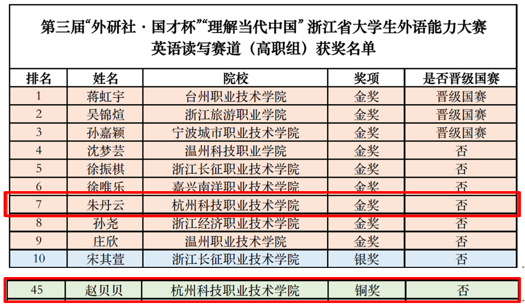 近日,第三届“外研社·国才杯”“理解当代中国”浙江省大学生外语能力大赛读写赛道结果揭晓。我校旅游管理学院酒店2401班的朱丹云(指导教师:叶芳、魏爽、何小宝)和商务管理学院跨境电商2401班赵贝贝(指导教师:黄琳、陈菊、陈宁红)两位同学凭借扎实的英语读写功底,在高职组脱颖而出,分别夺得金奖和铜奖,实现了我校在该项赛事读写赛道金奖突破!