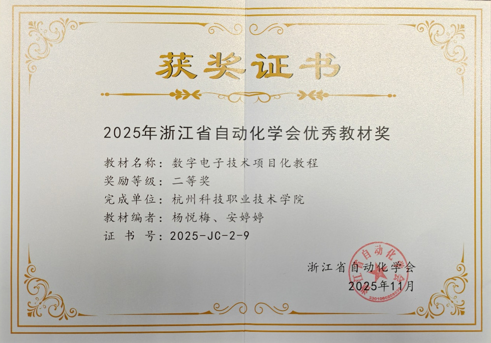 近日,由我校物联网技术学院院长杨悦梅主编,教师安婷婷、穆元彬、刘威、王科明等参编的《数字电子技术项目化教程》成功获评2025年浙江省自动化学会优秀教材奖二等奖,成为职业教育教材改革的典型范例。
