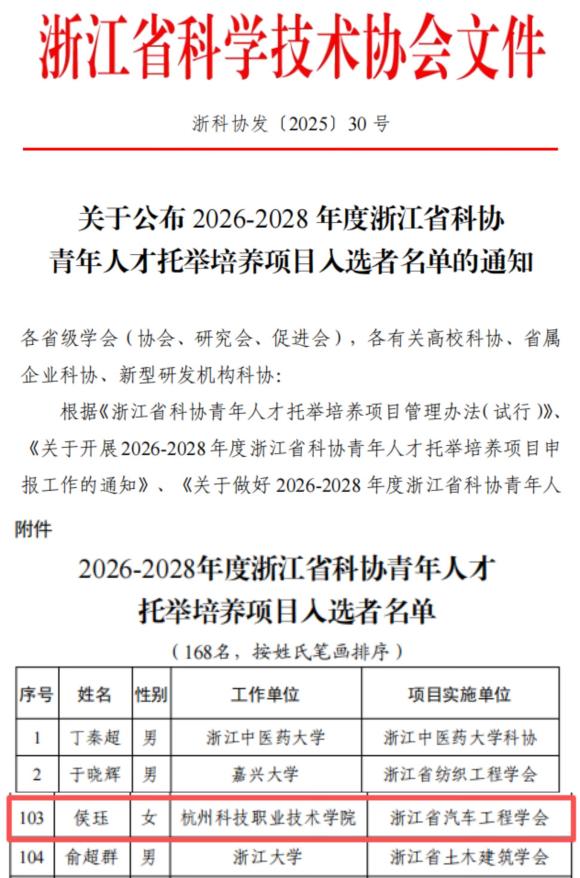 近日,浙江省科学技术协会公布了2026-2028年度浙江省科协青年人才托举培养项目入选者名单,我校汽车工程学院青年博士后侯珏老师成功入选。