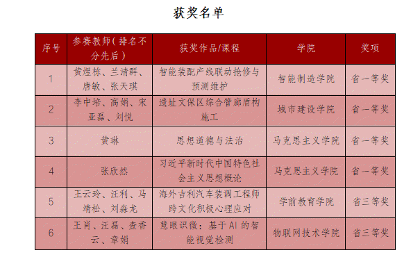 在各赛道的比拼中,我校获奖团队亮点纷呈。智能制造学院黄煜栋、兰清群、唐敏、张天琪团队,紧扣产业前沿岗位需求,以“智能装配产线联动抢修与预测维护”课程打造真实情景教学模式;城市建设学院李中培、高娟、宋亚磊、刘悦团队,将遗址文保区综合管廊盾构施工真实项目融入课堂,两支团队凭借“产教一体”的教学创新,双双斩获专业课程组一等奖。马克思主义学院教师黄琳、张欣然在“现场抽题、即时展示”的高难度考核中,以鲜明的价值引领、贴近学生的教学设计精准回应思想困惑,双双拿下思想政治理论课程组一等奖,刷新我校思政课程参赛最佳成绩。学前教育学院王云玲团队(《海外吉利汽车装调工程师跨文化积极心理应对》)、物联网技术学院王肖团队(《慧眼识微:基于AI的智能视觉检测》)凭借贴合专业特色的扎实设计,荣获三等奖,尽显我校教师多元教学风采。