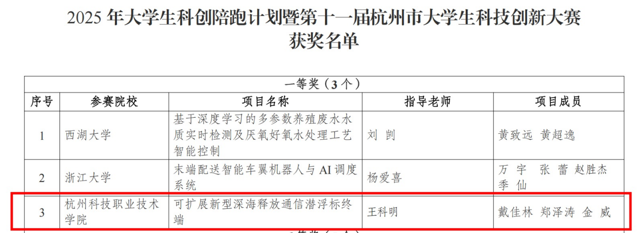 在近日落幕的2025年大学生科创陪跑计划暨第十一届杭州市大学生科技创新大赛中,我校参赛团队与全市优秀高校学子同台竞技,共获一等奖1项、三等奖1项、创新奖4项。学校因出色的组织工作和整体表现,荣膺大赛“优秀组织奖”。我校物联网技术学院参赛项目《可扩展新型深海释放通信潜浮标终端》凭借其突出的创新性、实用性与转化潜力,与西湖大学、浙江大学参赛项目共同斩获大赛一等奖。